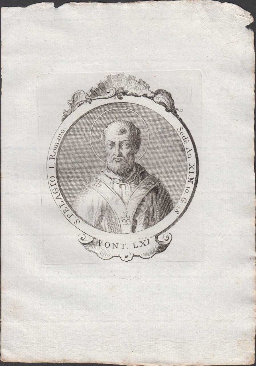 Stampa incisione Papa S. Pelagio I Romano Pont. LXI 1775 inc. G. B. Cavalieri