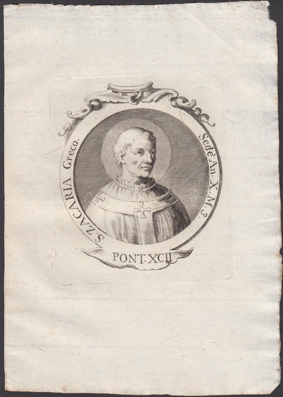 Stampa incisione Papa S. Zacaria Greco Pont. XCII 1775 inc. G. B. Cavalieri