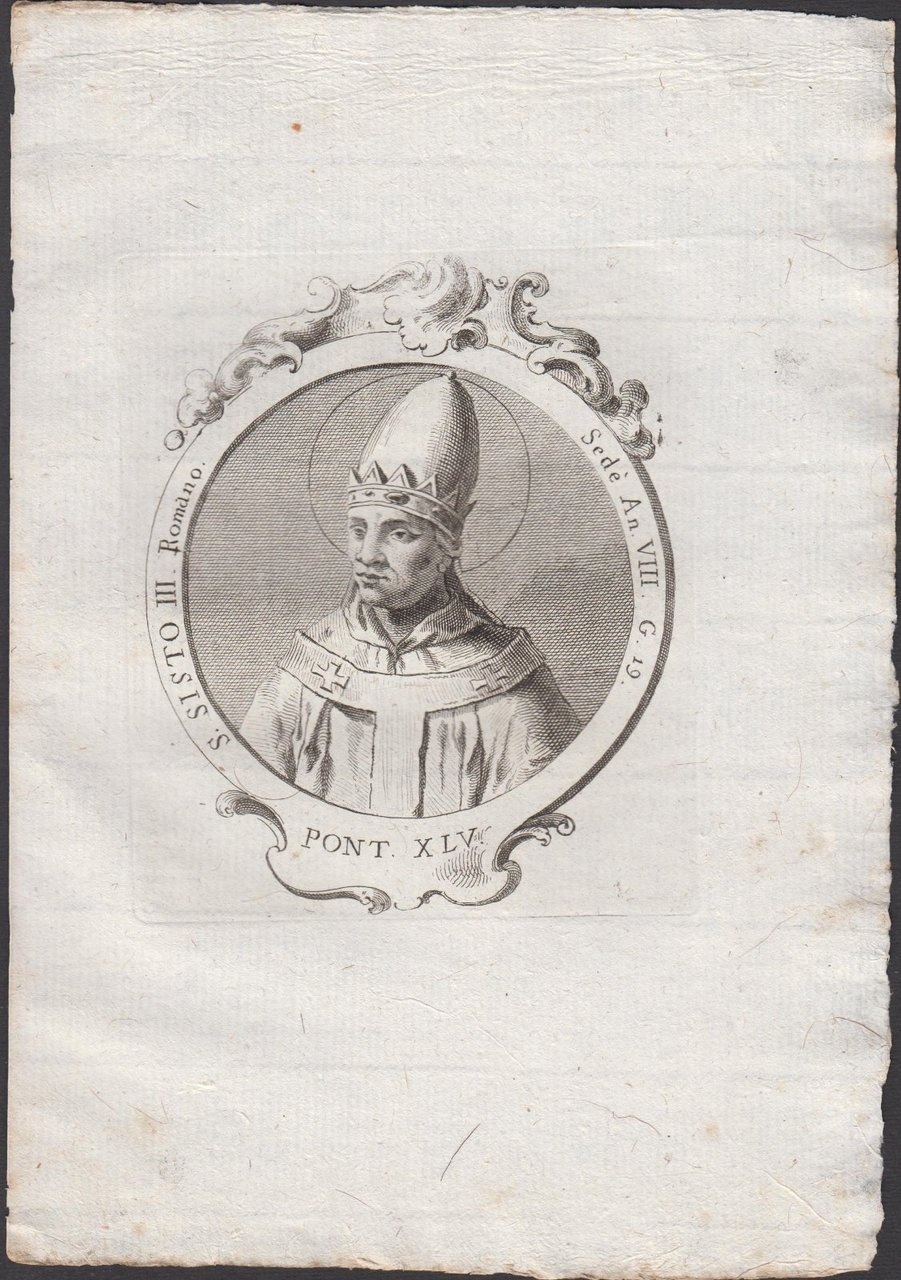 Stampa incisione Papa Sisto III Romano Pont. XLV 1775 inc. G. B. Cavalieri
