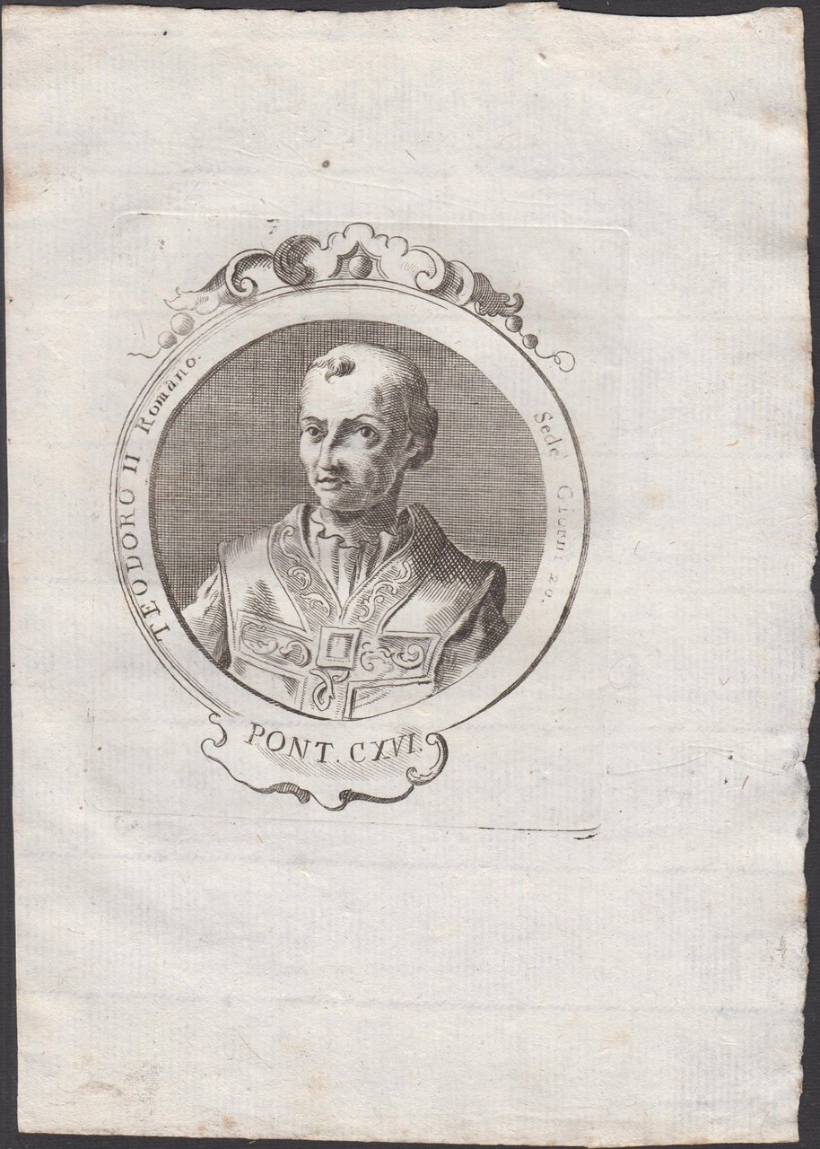 Stampa incisione Papa Teodoro II Pont. CXVI 1775 inc. G. B. Cavalieri