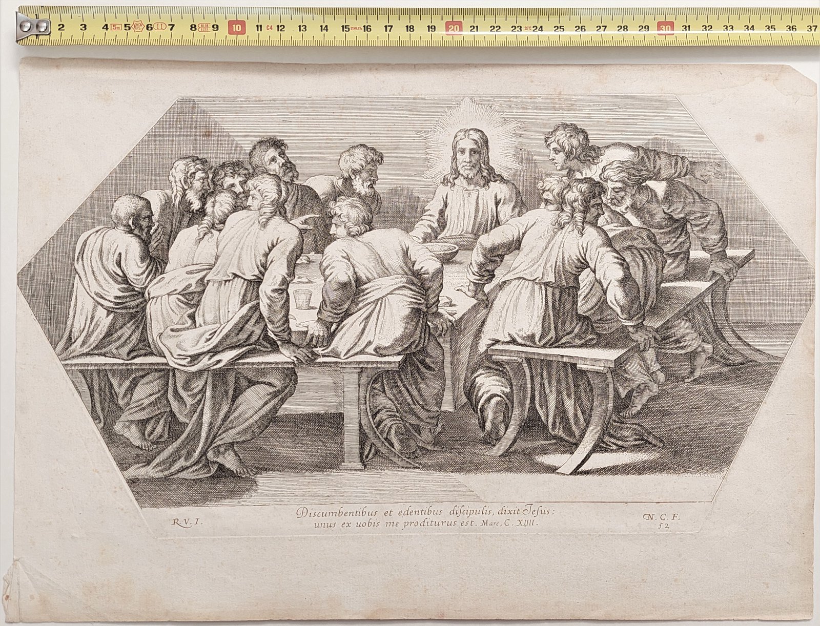Stampa Incisione Ultima cena Nicolaus Chapron 1649 da un dipinto di Raffaello