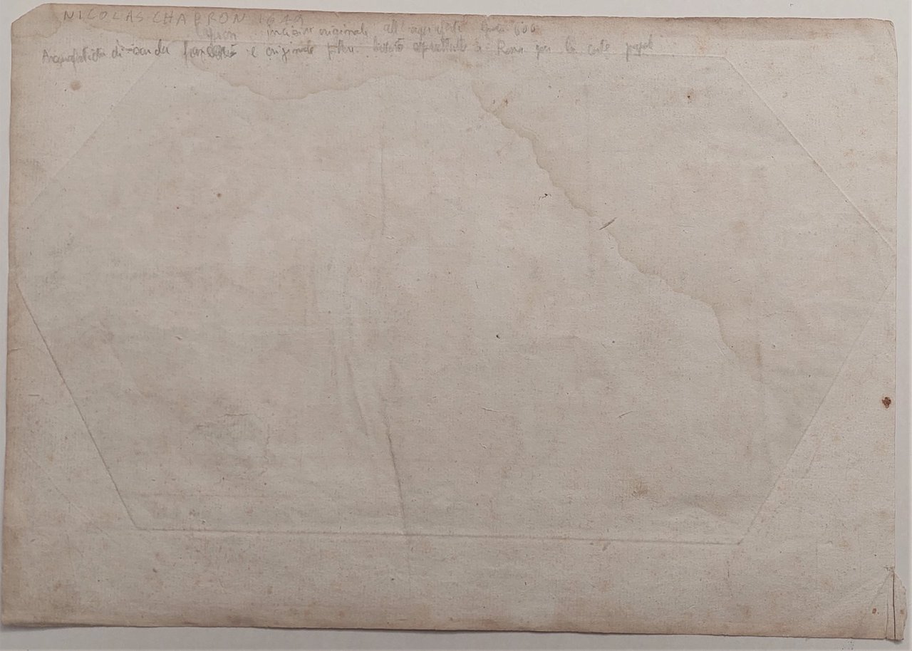 Edizione molto rara, Leggere ma diffuse fioriture su tutto il foglio, una grossa macchia di umidità nella parte destra del foglio e su tutto il margine superiore, la stampa è rifilata, con parziale perdita della parte incisa, mancano circa 2 cm al margine destro e circa 1 cm al margine sinistro, una mancanza di circa 2 cm all'angolo superiore destro, alcune pieghe assottigliamento della carta visibile al verso nella parte inferiore sinistra di CM 3 x 3, qualche piccolo strappo ai margini.