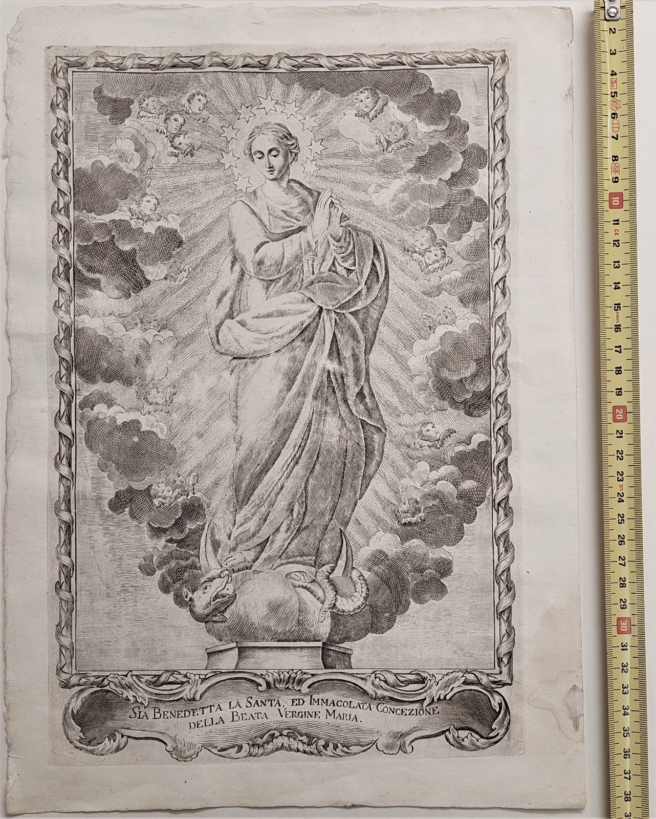 La stampa raffigura la Vergine Maria che schiaccia la testa al serpente, simbolo del demonio, circondata da una nube sfolgorante e un coro di putti.