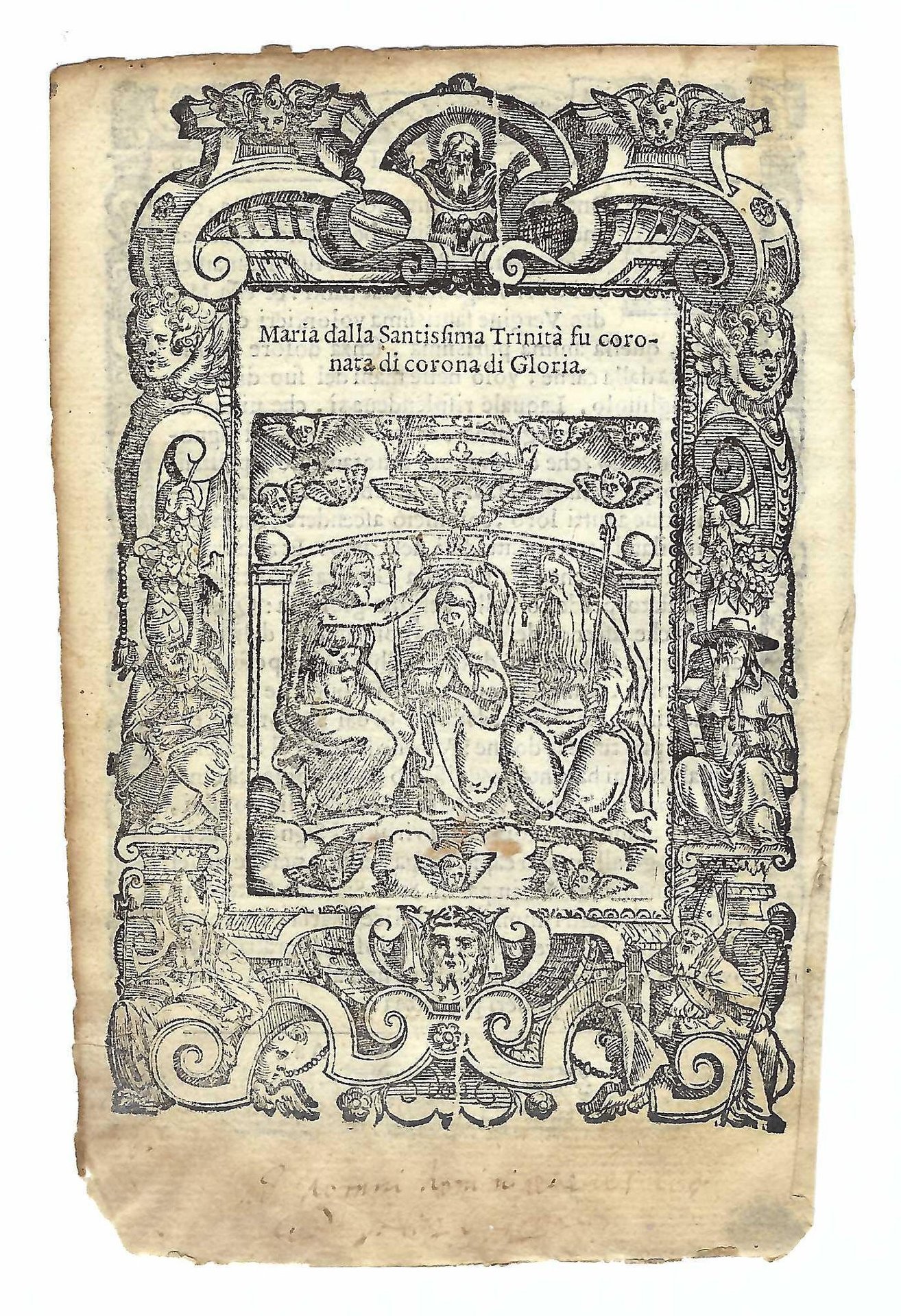 Xilografia cm. 15,7 x 10,5 il foglio, cm 13,7 x 9,4 parte incisa, bruniture ai margini, lievi mancanze al margine inferiore sinistro, margine inferiore esterno brunito e assottigliato