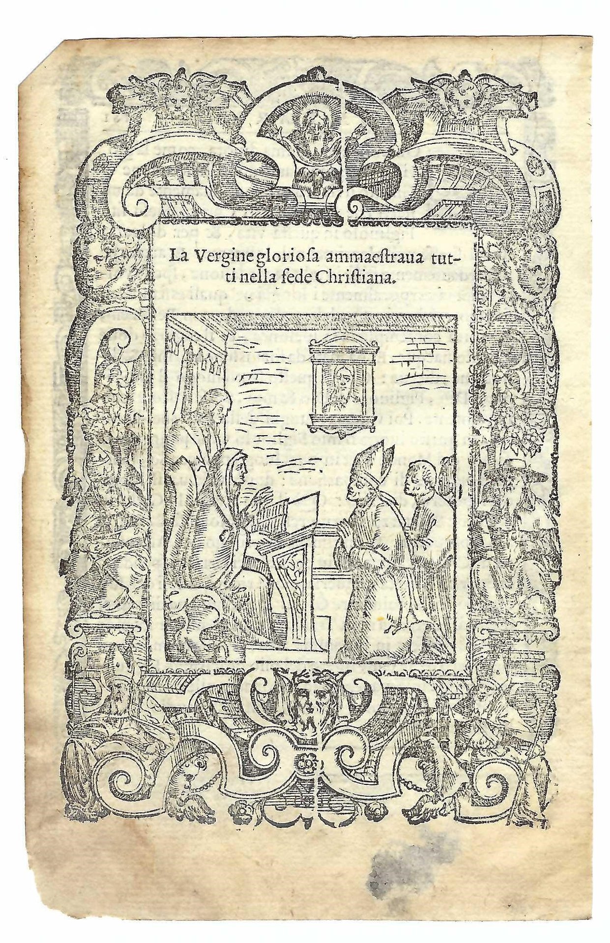 Xilografia cm. 15,7 x 10,5 il foglio, cm 13,7 x 9,4 parte incisa, bruniture ai margini, lievi mancanze al margine inferiore sinistro, margine inferiore esterno brunito e assottigliato