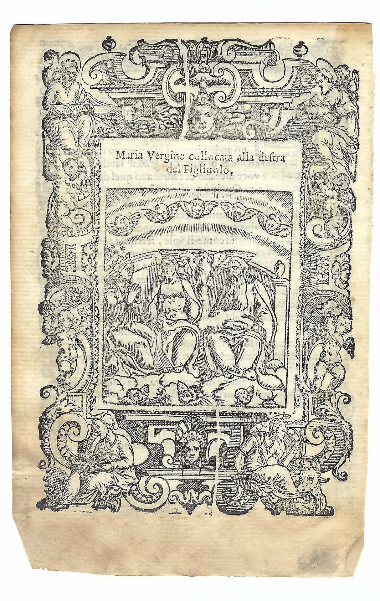 Xilografia cm. 15,7 x 10,5 il foglio, cm 13,7 x 9,4 parte incisa, bruniture ai margini, lievi mancanze al margine inferiore sinistro, margine inferiore esterno brunito e assottigliato