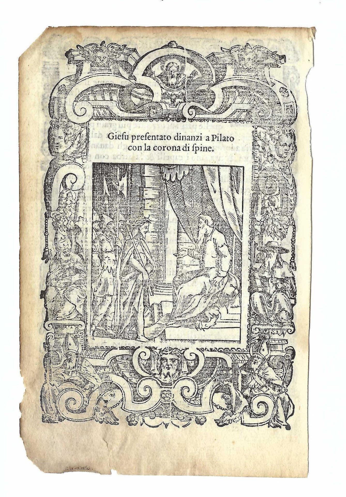 Xilografia cm. 15,7 x 10,5 il foglio, cm 13,7 x 9,4 parte incisa, bruniture ai margini, un piccolo strappo al margine inferiore senza interessamento della stampa, margine inferiore esterno brunito e assottigliato