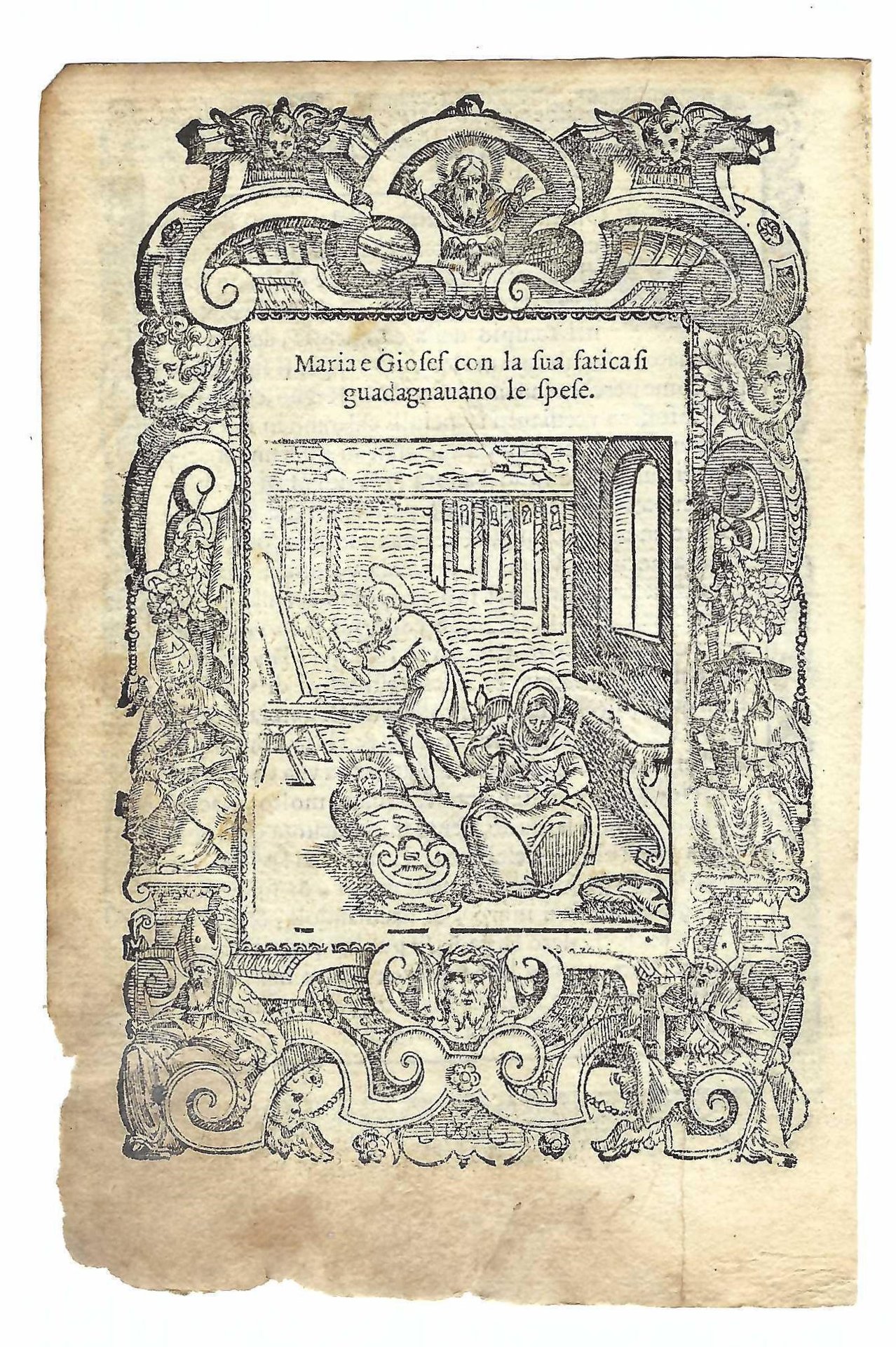 Xilografia cm. 15,7 x 10,5 il foglio, cm 13,7 x 9,4 parte incisa, bruniture ai margini, lievi mancanze al margine inferiore sinistro, margine inferiore esterno brunito e assottigliato