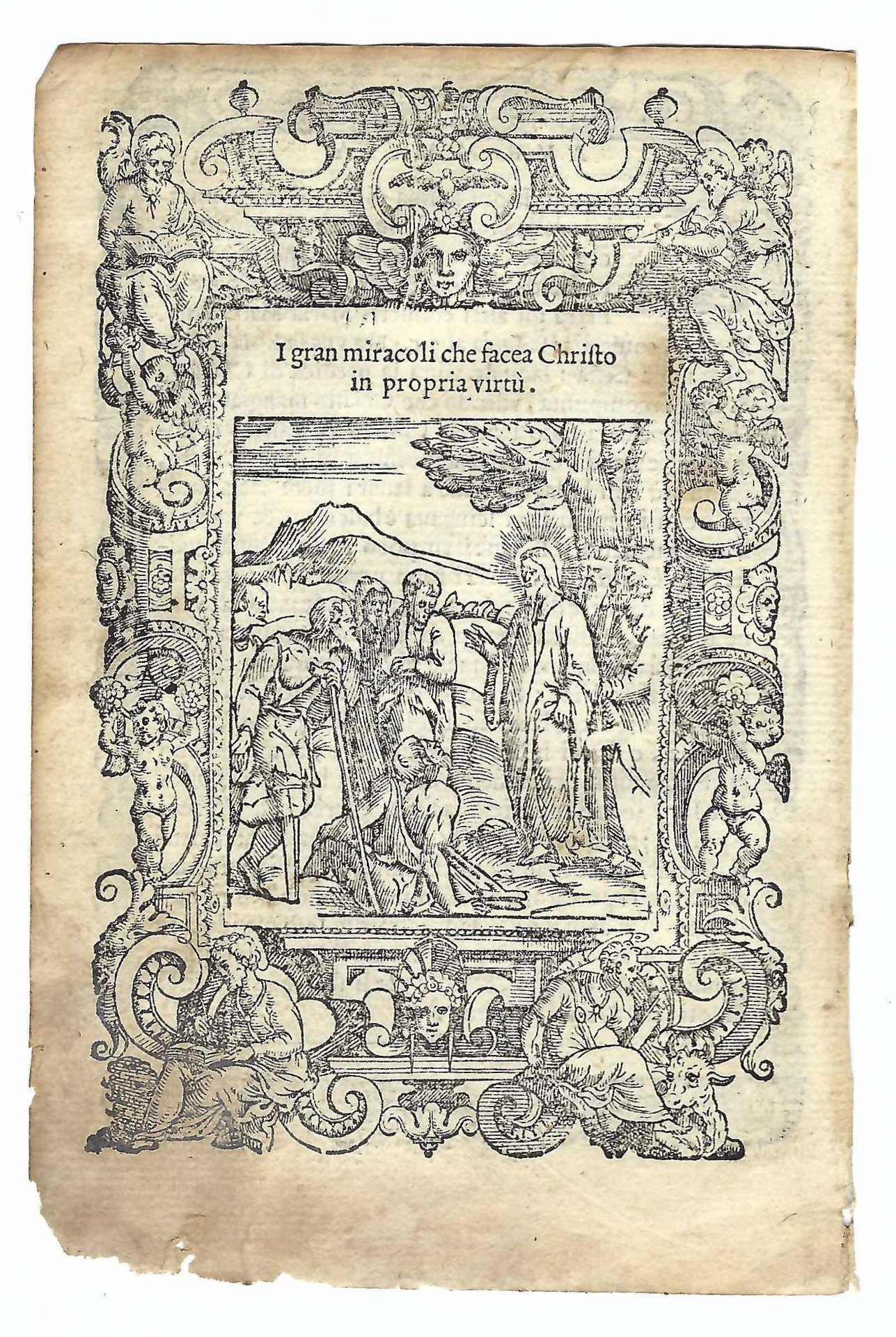 Xilografia cm. 15,7 x 10,5 il foglio, cm 13,7 x 9,4 parte incisa, bruniture ai margini, un piccolo strappo al margine inferiore senza interessamento della stampa, margine inferiore esterno brunito e assottigliato