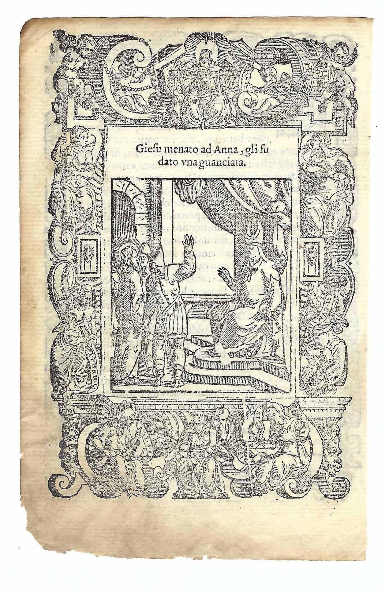 Stampa old print Il sommo sacerdote Anna da uno schiaffo a Gesù A. Da Castello 1575