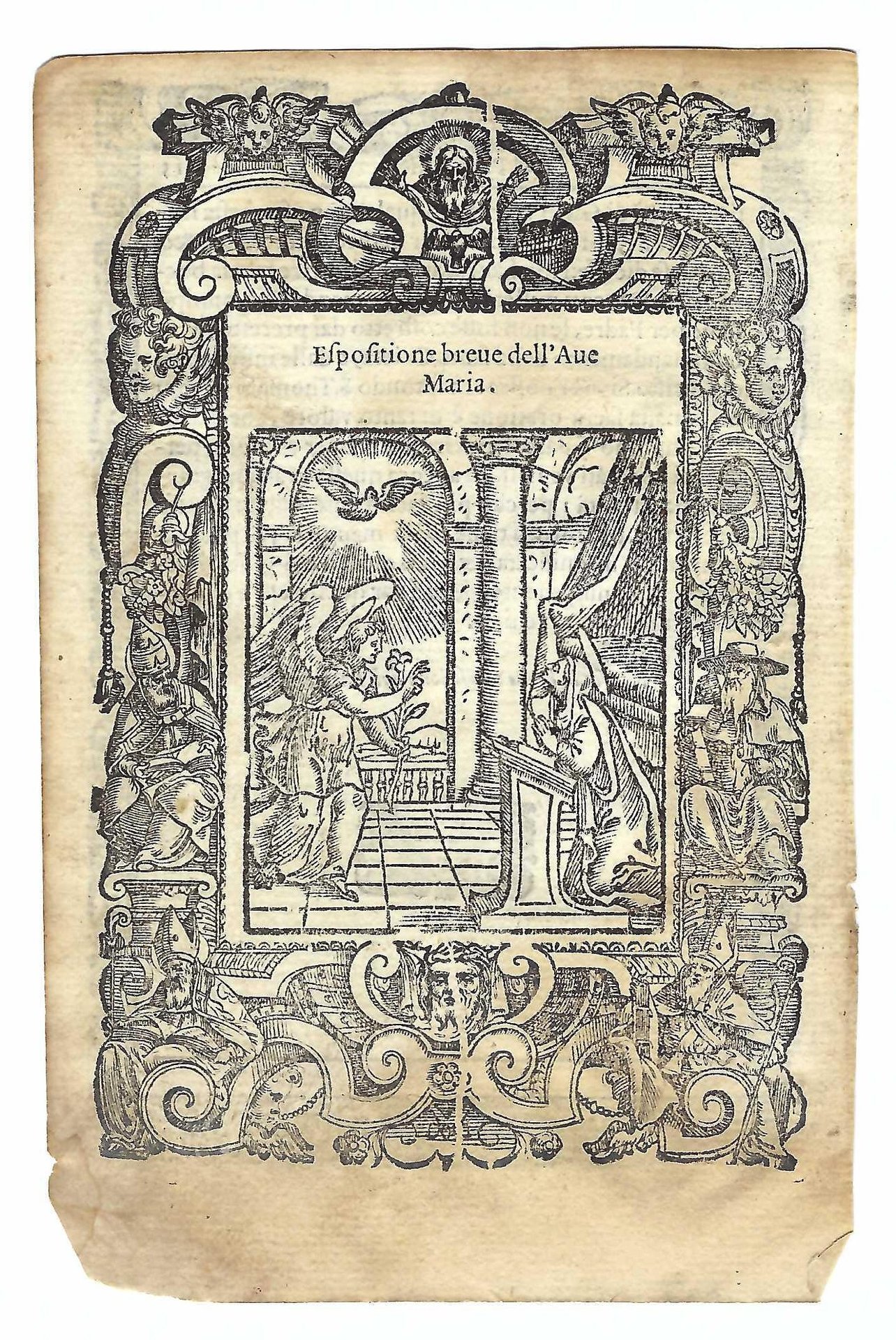 Xilografia cm. 15,7 x 10,5 il foglio, cm 13,7 x 9,4 parte incisa, bruniture ai margini, lievi mancanze al margine inferiore sinistro, margine inferiore esterno brunito e assottigliato