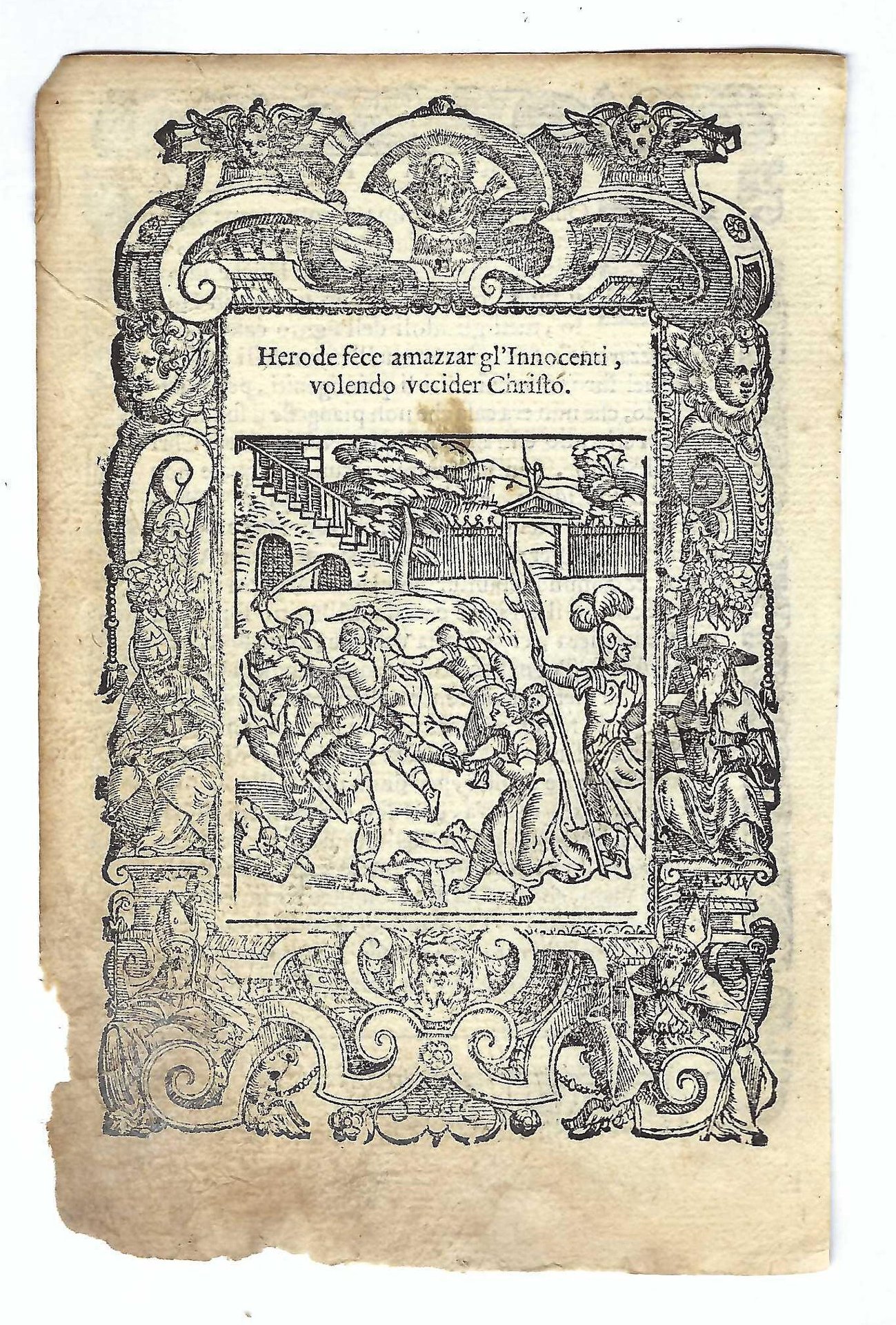 Xilografia cm. 15,7 x 10,5 il foglio, cm 13,7 x 9,4 parte incisa, bruniture ai margini, uno strappo al margine inferiore senza interessamento della stampa, margine inferiore esterno brunito e assottigliato