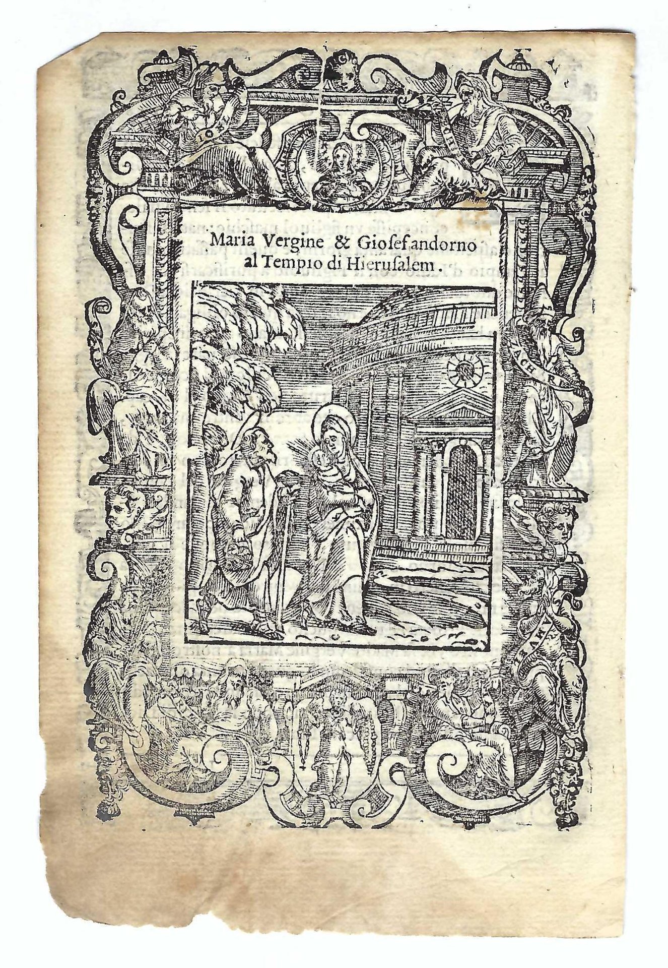 Xilografia cm. 15,7 x 10,5 il foglio, cm 13,7 x 9,4 parte incisa, bruniture ai margini, uno strappo al margine inferiore senza interessamento della stampa, margine inferiore esterno brunito e assottigliato