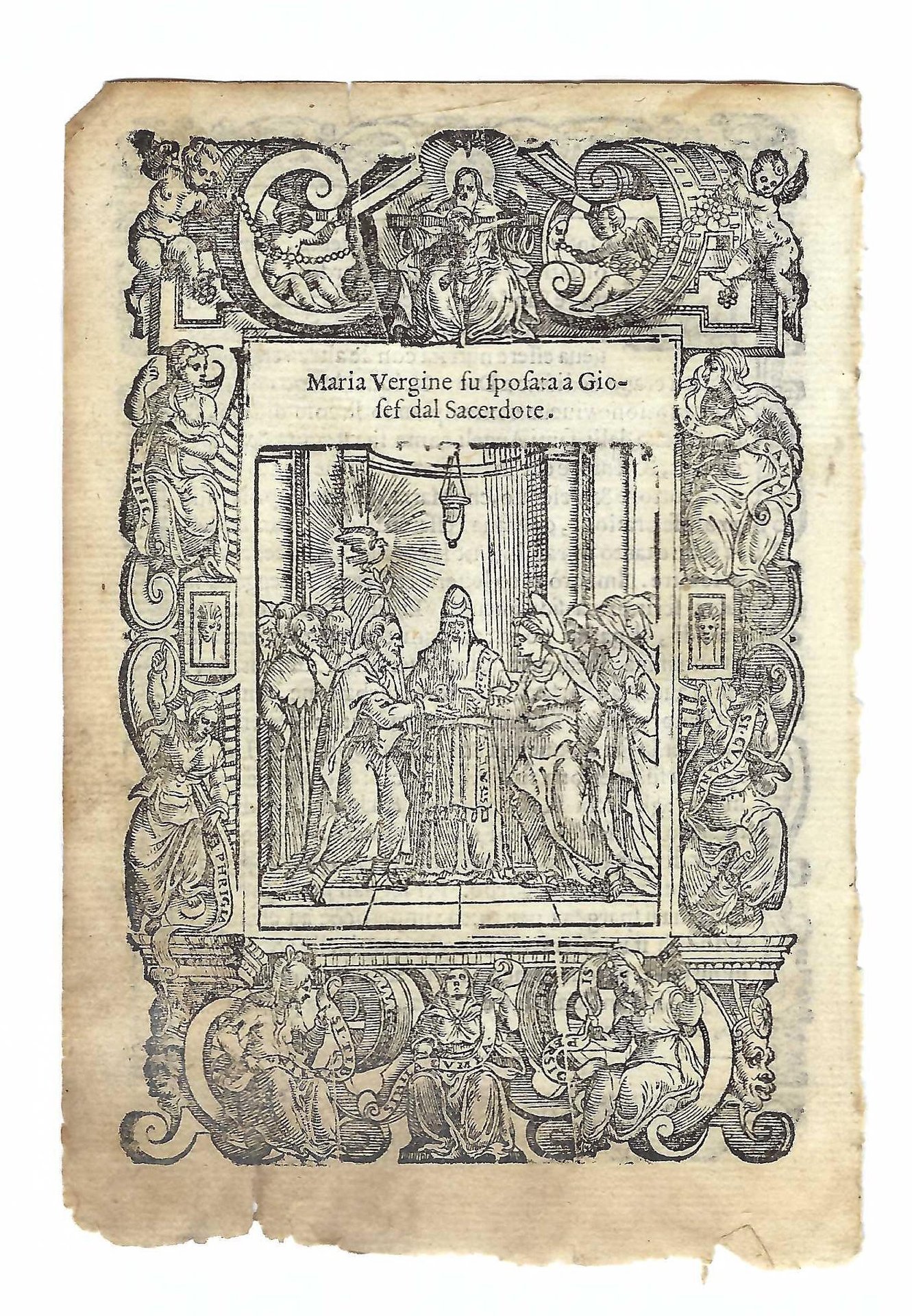 Xilografia cm. 15,7 x 10,5 il foglio, cm 13,7 x 9,4 parte incisa, bruniture ai margini, uno strappo al margine inferiore di cm. 1,5 con lieve interessamento della stampa, margine inferiore esterno brunito e assottigliato