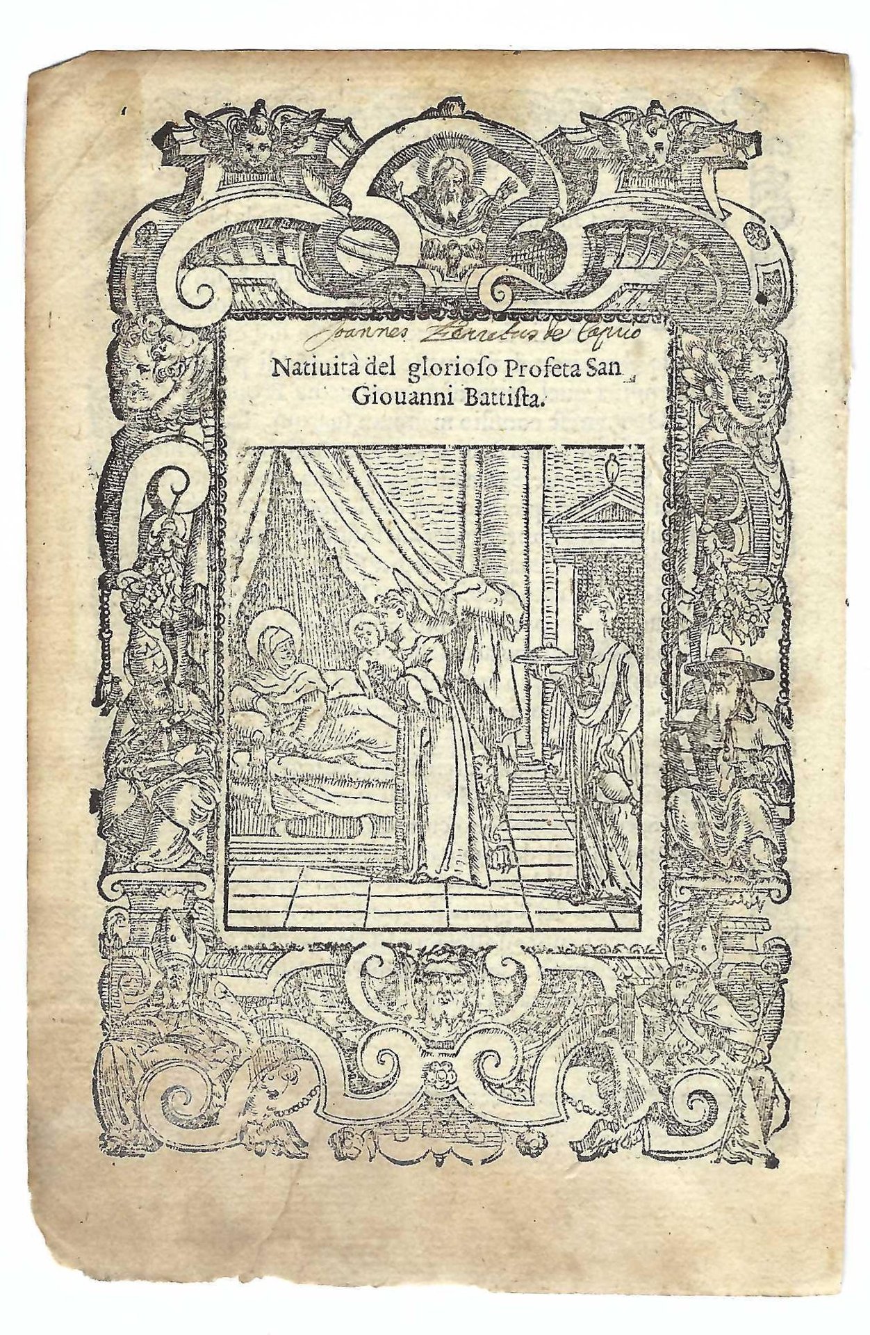 Xilografia cm. 15,7 x 10,5 il foglio, cm 13,7 x 9,4 parte incisa, bruniture ai margini, uno strappo al margine inferiore di cm 1,5 con lieve interessamento della stampa, margine inferiore esterno brunito e assottigliato