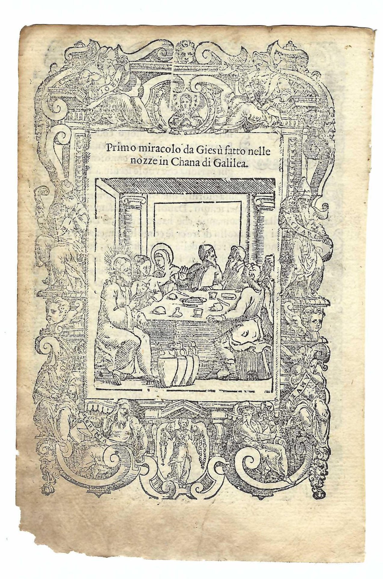 Xilografia cm. 15,7 x 10,5 il foglio, cm 13,7 x 9,4 parte incisa, bruniture ai margini, lievi mancanze al margine inferiore sinistro, margine inferiore esterno brunito e assottigliato