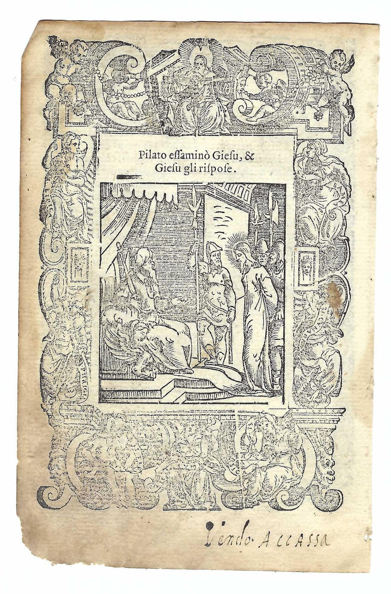 Xilografia cm. 15,7 x 10,5 il foglio, cm 13,7 x 9,4 parte incisa, bruniture ai margini, lievi mancanze al margine inferiore sinistro, margine inferiore esterno brunito e assottigliato, una scitta coeva al margine inferiore