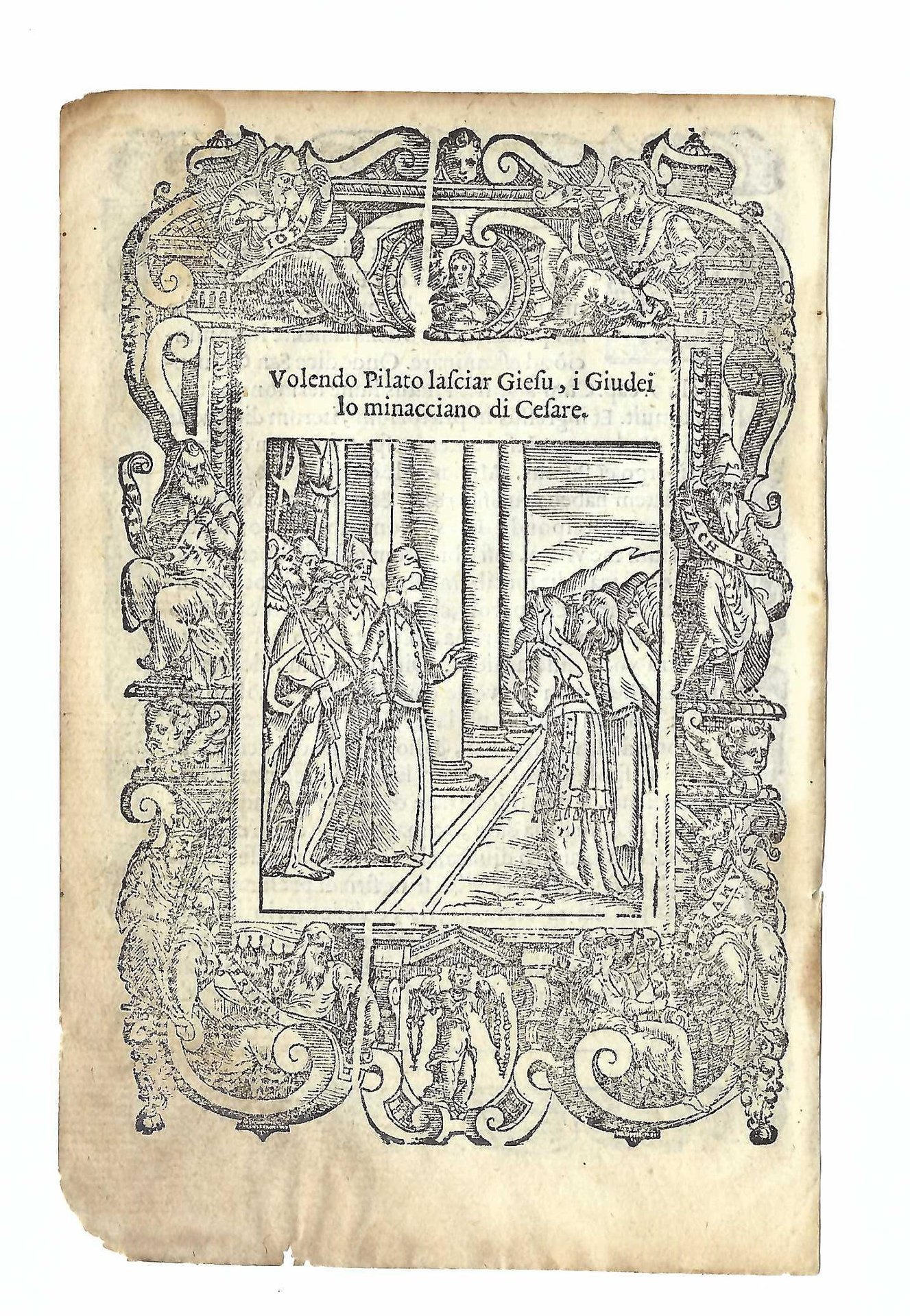 Xilografia cm. 15,7 x 10,5 il foglio, cm 13,7 x 9,4 parte incisa, bruniture ai margini, un piccolo strappo al margine inferiore senza interessamento della stampa, margine inferiore esterno brunito e assottigliato