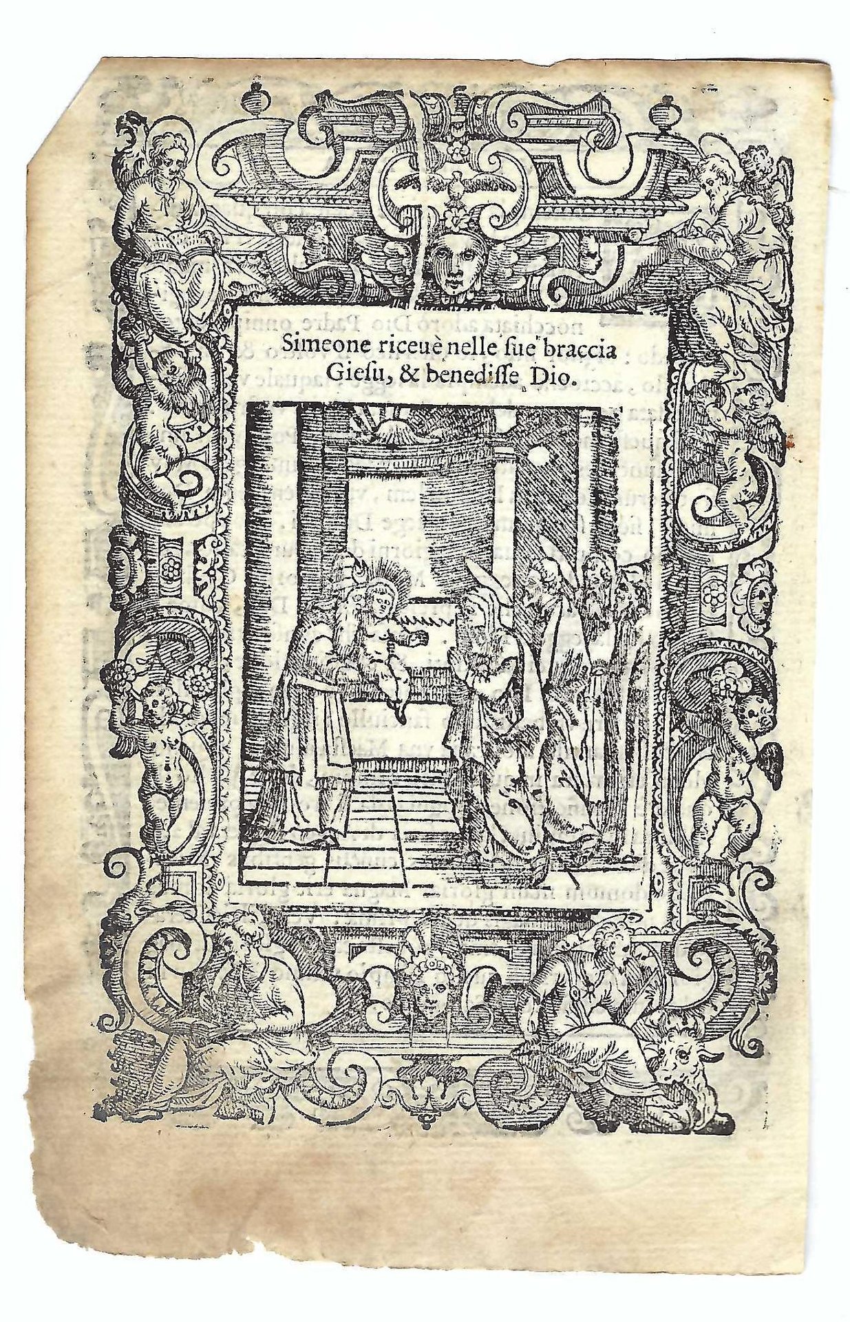 Xilografia cm. 15,7 x 10,5 il foglio, cm 13,7 x 9,4 parte incisa, bruniture ai margini, uno strappo al margine inferiore senza interessamento della stampa, margine inferiore esterno brunito e assottigliato