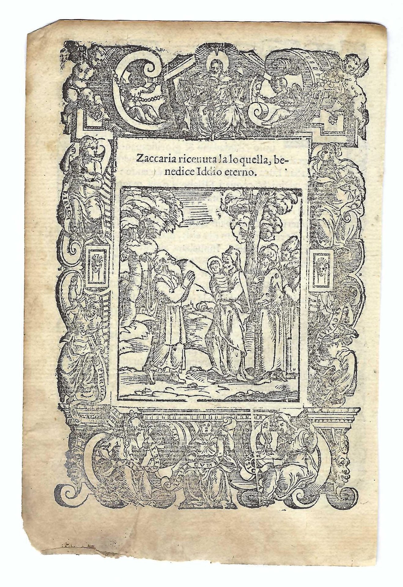 Xilografia cm. 15,7 x 10,5 il foglio, cm 13,7 x 9,4 parte incisa, bruniture ai margini, uno strappo al margine inferiore con lieve interessamento della stampa, margine inferiore esterno brunito e assottigliato