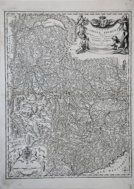Entro la cornice graduata, all'angolo superiore destro, titolo con dedica dell'autore a Ottavio Manin con data della tavola (1693), riquadrato in bel cartiglio a foggia di drappo retto da putti, sormontato dall'arma gentilizia del dedicatario; all'angolo inferiore sinistro, scala metrica di 30 miglia d'Italia, sormontata da arma del duca di Savoia. L'immagine è una carta degli Stati del Duca di savoia al di qua e al di là ' delle Alpi, con parte di territori confinanti: sono rappresentati la Savoia, il Piemonte e il Monferrato, il Nizzardo e parte della Liguria di Ponente; in alto a sinistra, spicca il lago di Ginevra. ' Opera tratta dal ' Corso geografico universale, o sia la terra divisa nelle sue parti e subdistinta ne' suoi gran regni. Esposta in tavole geografiche ricorrette et accresciute di tutte le nuove scoperte, ad uso dell'Accademia Cosmografica degli Argonauti dal Padre Maestro Vincenzo Coronelli M. C. Cosmografo della Serenissima Republica di Venetia. Dedicata alla Santità di Nostro Signore Innocenzo XII. P. I. In Venetia, a spese dell'autore. MDCXCII. Coronelli visse un periodo di straordinaria fecondità editoriale a partire dal 1689, quando ebbe la cattedra di geografia presso l'Università alle Procuratie, con la pubblicazione, nel 1690, del primo volume dell'Atlante Veneto. In effetti sotto il nome di ' Atlante Veneto ' va tutta la raccolta di tredici opere composte nell'arco del decennio successivo, dall'Isolario ' allo ' Specchio del mare. In realtà solo alcune di tali opere possono definirsi atlante, e sono di valore molto disuguale, dato che si passa da opere originali e fondamentali come quelle citate o il ' Corso Geografico ' ad opere di compilazione o semplici raccolte di vedute. Il ' Corso Geografico ' uscì in diverse edizioni con numeri diversi di carte - sessantotto tavole nel 1689-92; di centosettantatré tavole nel 1692; duecentosessanta tavole, nel 1694-97 - che venivano vendute anche separatamente, al ritmo di sei carte al mese per due anni. Le carte furono incise tra il 1688 e il 1692 nell'attrezzatissima officina cartografica del convento dei Frari, dove lavoravano anche incisori stranieri. ' Incisione in rame, in ottimo stato di conservazione. Fine example this striking map of Piemonte and Savoye, from Vincenzo Maria Coronelli's Corso Geographico, published in Venice.The map provides a fantastic image of the topography of the region, naming mountains, rivers, lakes, towns, castles, etc. Includes an elegant cartouche and 2 coats of arms. It is without question on of the most beautiful and detailed maps of the region to appear in a commercial atlas at the end of the 17th Century. The map is taken from ' Corso geografico universale, o sia la terra divisa nelle sue parti e subdistinta ne' suoi gran regni. Esposta in tavole geografiche ricorrette et accresciute di tutte le nuove scoperte, ad uso dell'Accademia Cosmografica degli Argonauti dal Padre Maestro Vincenzo Coronelli M. C. Cosmografo della Serenissima Republica di Venetia. Dedicata alla Santità di Nostro Signore Innocenzo XII. P. I. In Venetia, a spese dell'autore. MDCXCII. Coronelli lived a period of extraordinary editorial fecundity starting from 1689, when he had the chair of geography at the University at the Procuratie, with the publication, in 1690, of the first volume of the ' Atlante Veneto. Under the name of ' Atlante Veneto ' goes the entire collection of thirteen works composed over the next decade, from the ' Isolario ' to the ' Specchio del mare. ' In reality, only some of these works can be defined as atlas, and are of very unequal value, since we go from original and fundamental works such as those mentioned or the ' Corso Geografico ' to works of compilation or simple collections of views. The ' Corso Geografico ' came out in several editions with different numbers of maps - sixty-eight maps in 1689-92; one hundred and seventy-three maps in 1692; two hundred and sixty maps in 1694-97 - which were also sold separately, at the rate of six a month for two years. The maps were alle engraved between 1688 and 1692 in the well-equipped cartographic workshop of the Frari convent, where foreign engravers also worked. ' Copperplate, in good condition. Cfr. BARRERA F., "Il Piemonte nella cartografia del Settecento 1690-1790", Torino 1990, p. 23 num. 62.