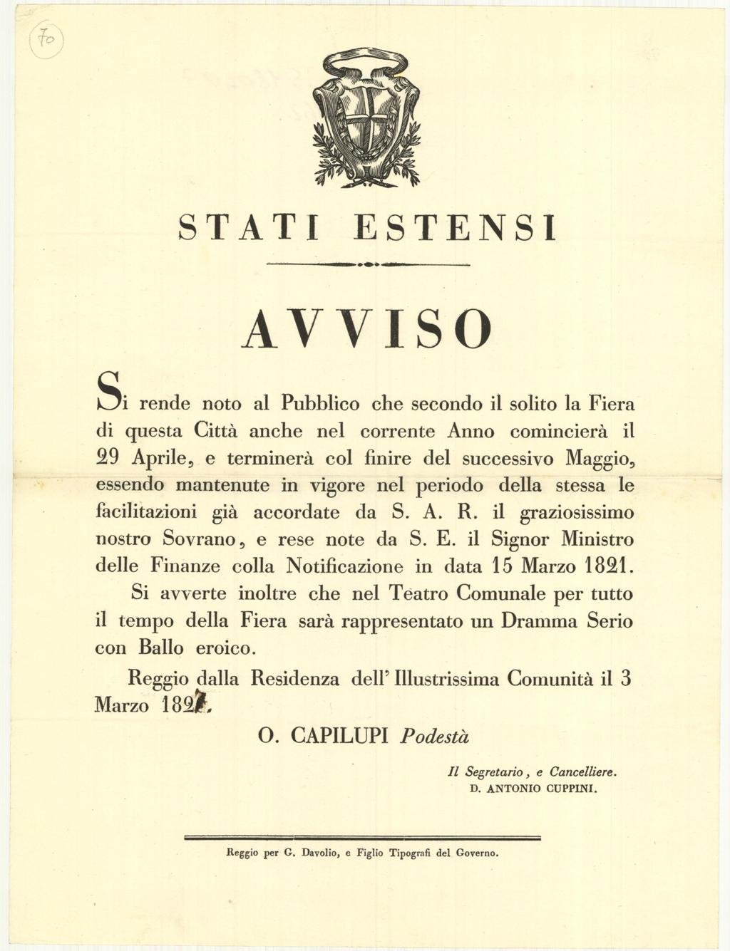 Documento, antico ed originale proveniente da importante collezione reggiana, in cui viene scritto “Si rende noto al Pubblico che secondo il solito la Fiera di questa Città anche nel corrente Anno comincerà il 29 Aprile, e terminerà col finire del successivo Maggio…” Reggio dalla Residenza dell’Illustrissima Comunità il 3 Marzo 1827. O. Capilupi Podestà. Il Segretario, e Cancelliere. D. Antonio Cuppini - Reggio per G. Davolio, e Figlio Tipografi del Governo