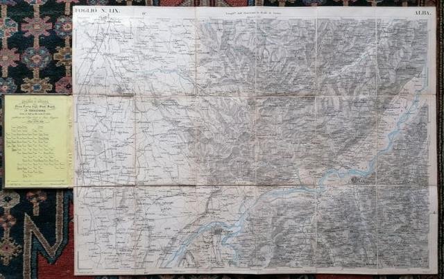 Dalla “Gran Carta Topografica degli Stati Sardi in Terraferma. Di S. M. il Re di Sardegna. Divisa in fogli 91 alla scala di 1 a 50.000. Opera del Corpo Reale dello Stato Maggiore”, pubblicata dal Corpo Reale di Stato Maggiore, nell’anno 1852. Carta telata e ripiegata contenuta in originale cartella telata marrone, cm 53,5 x 72,5 circa, titolo oro al dorso, piatti impressi, al contropiatto anteriore, su carta gialla, il “Quadro D’Unione”, ossia la tabellina contenente i titoli delle 91 carte che compongono l’insieme (questa la numero 59), a fronte, applicata su un riquadro della carta, una legenda con segni convenzionali e scale metriche, espresse in miglia piemontesi e miglia italiane. Gli Stati di Terraferma erano costituiti dal Piemonte, dalla Savoia, dal Geovesato, e comprendevano Nizza e l’isola di Capraia. Delineata con grande precisione per l’aspetto fisico, quindi nella sua orografia e idrografia, ciascuna di queste carte presenta anche una particolare attenzione al sistema viario, con segnate borgate e cascine, segnala ogni tipo di strade, mulattiere e sentieri, nonché le linee ferroviarie già attive e quelle in costruzione, i limiti di Stato, Provincia e Comune. (cfr.: F. Barrera, “Il Piemonte nella Cartografia degli Stati Sardi tra Restaurazione e Unità d’Italia”).