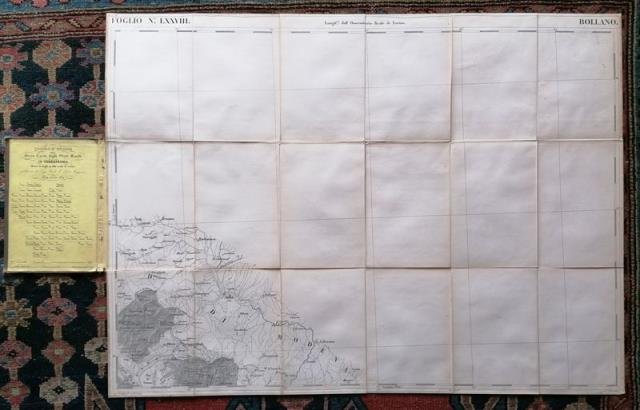 Dalla “Gran Carta Topografica degli Stati Sardi in Terraferma. Di S. M. il Re di Sardegna. Divisa in fogli 91 alla scala di 1 a 50.000. Opera del Corpo Reale dello Stato Maggiore”, pubblicata dal Corpo Reale di Stato Maggiore, nell’anno 1852. Carta telata e ripiegata contenuta in originale cartella telata marrone, cm 53,5 x 72,5 circa, titolo oro al dorso, piatti impressi, al contropiatto anteriore, su carta gialla, il “Quadro D’Unione”, ossia la tabellina contenente i titoli delle 91 carte che compongono l’insieme (questa la numero 78), a fronte, applicata su un riquadro della carta, una legenda con segni convenzionali e scale metriche, espresse in miglia piemontesi e miglia italiane. Gli Stati di Terraferma erano costituiti dal Piemonte, dalla Savoia, dal Geovesato, e comprendevano Nizza e l’isola di Capraia. Delineata con grande precisione per l’aspetto fisico, quindi nella sua orografia e idrografia, ciascuna di queste carte presenta anche una particolare attenzione al sistema viario, con segnate borgate e cascine, segnala ogni tipo di strade, mulattiere e sentieri, nonché le linee ferroviarie già attive e quelle in costruzione, i limiti di Stato, Provincia e Comune. (cfr.: F. Barrera, “Il Piemonte nella Cartografia degli Stati Sardi tra Restaurazione e Unità d’Italia”).Minimi difetti al dorso.