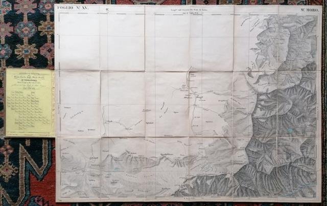 Dalla “Gran Carta Topografica degli Stati Sardi in Terraferma. Di S. M. il Re di Sardegna. Divisa in fogli 91 alla scala di 1 a 50.000. Opera del Corpo Reale dello Stato Maggiore”, pubblicata dal Corpo Reale di Stato Maggiore, nell’anno 1852. Carta telata e ripiegata contenuta in originale cartella telata marrone, cm 53,5 x 72,5 circa, titolo oro al dorso, piatti impressi, al contropiatto anteriore, su carta gialla, il “Quadro D’Unione”, ossia la tabellina contenente i titoli delle 91 carte che compongono l’insieme (questa la numero 15), a fronte, applicata su un riquadro della carta, una legenda con segni convenzionali e scale metriche, espresse in miglia piemontesi e miglia italiane. Gli Stati di Terraferma erano costituiti dal Piemonte, dalla Savoia, dal Geovesato, e comprendevano Nizza e l’isola di Capraia. Delineata con grande precisione per l’aspetto fisico, quindi nella sua orografia e idrografia, ciascuna di queste carte presenta anche una particolare attenzione al sistema viario, con segnate borgate e cascine, segnala ogni tipo di strade, mulattiere e sentieri, nonché le linee ferroviarie già attive e quelle in costruzione, i limiti di Stato, Provincia e Comune. (cfr.: F. Barrera, “Il Piemonte nella Cartografia degli Stati Sardi tra Restaurazione e Unità d’Italia”).