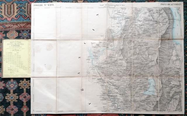 Dalla “Gran Carta Topografica degli Stati Sardi in Terraferma. Di S. M. il Re di Sardegna. Divisa in fogli 91 alla scala di 1 a 50.000. Opera del Corpo Reale dello Stato Maggiore”, pubblicata dal Corpo Reale di Stato Maggiore, nell’anno 1852. Carta telata e ripiegata contenuta in originale cartella telata marrone, cm 53,5 x 72,5 circa, titolo oro al dorso, piatti impressi, al contropiatto anteriore, su carta gialla, il “Quadro D’Unione”, ossia la tabellina contenente i titoli delle 91 carte che compongono l’insieme (questa la numero 26), a fronte, applicata su un riquadro della carta, una legenda con segni convenzionali e scale metriche, espresse in miglia piemontesi e miglia italiane. Gli Stati di Terraferma erano costituiti dal Piemonte, dalla Savoia, dal Geovesato, e comprendevano Nizza e l’isola di Capraia. Delineata con grande precisione per l’aspetto fisico, quindi nella sua orografia e idrografia, ciascuna di queste carte presenta anche una particolare attenzione al sistema viario, con segnate borgate e cascine, segnala ogni tipo di strade, mulattiere e sentieri, nonché le linee ferroviarie già attive e quelle in costruzione, i limiti di Stato, Provincia e Comune. (cfr.: F. Barrera, “Il Piemonte nella Cartografia degli Stati Sardi tra Restaurazione e Unità d’Italia”).