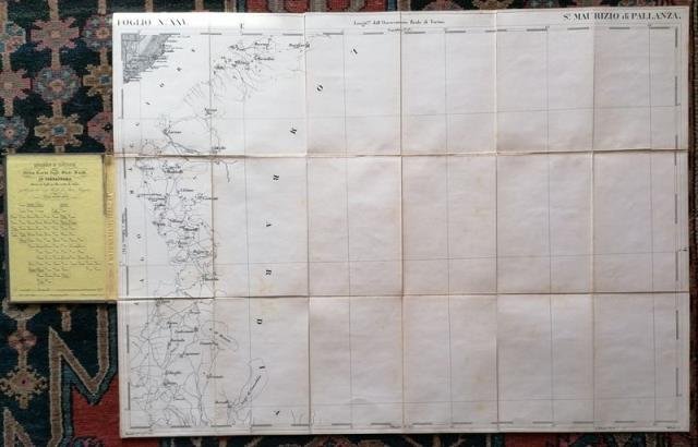 Dalla “Gran Carta Topografica degli Stati Sardi in Terraferma. Di S. M. il Re di Sardegna. Divisa in fogli 91 alla scala di 1 a 50.000. Opera del Corpo Reale dello Stato Maggiore”, pubblicata dal Corpo Reale di Stato Maggiore, nell’anno 1852. Carta telata e ripiegata contenuta in originale cartella telata marrone, cm 53,5 x 72,5 circa, titolo oro al dorso, piatti impressi, al contropiatto anteriore, su carta gialla, il “Quadro D’Unione”, ossia la tabellina contenente i titoli delle 91 carte che compongono l’insieme (questa la numero 25), a fronte, applicata su un riquadro della carta, una legenda con segni convenzionali e scale metriche, espresse in miglia piemontesi e miglia italiane. Gli Stati di Terraferma erano costituiti dal Piemonte, dalla Savoia, dal Geovesato, e comprendevano Nizza e l’isola di Capraia. Delineata con grande precisione per l’aspetto fisico, quindi nella sua orografia e idrografia, ciascuna di queste carte presenta anche una particolare attenzione al sistema viario, con segnate borgate e cascine, segnala ogni tipo di strade, mulattiere e sentieri, nonché le linee ferroviarie già attive e quelle in costruzione, i limiti di Stato, Provincia e Comune. (cfr.: F. Barrera, “Il Piemonte nella Cartografia degli Stati Sardi tra Restaurazione e Unità d’Italia”).