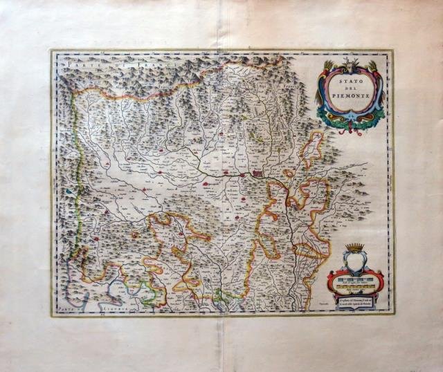 Amsterdam, 1660 circa. Incisione in rame, colore d’epoca, cm 38 x 49,8 (alla lastra). Esemplare con rialzo in oro alla corona e al cartiglio. Bell’esemplare a pieni margini e con piccole finiture oro.