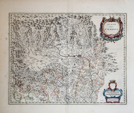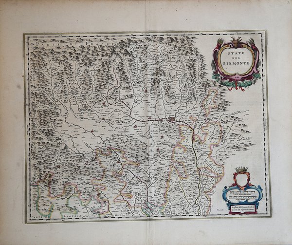 Carta geografica del Piemonte, eseguita sul modello di Magini. ' Willem Janszoon Blaeu, avviò nel 1599 la sua attività di costruttore di globi e strumenti astronomici ad Amsterdam. Nel 1630, dopo aver comprato alcune lastre dell’atlante del Mercator da Jodocus Hondius II, fu in grado di pubblicare un volume di 60 mappe con il titolo di ' Atlantis Appendix. Cinque anni dopo, pubblicò i primi due volumi del suo atlante ' Atlas Novus ' o ' Theatrum Orbis Terrarum, ' in sei libri. Dopo la sua morte, Joan (Johannes) continuò l’opera paterna, completando l’intera serie di sei volume dell’Atlas Novus ' intorno al 1655. Fu inoltre autore di un ' Atlas Maior sive Cosmographia Blaviana, in 12 volumi pubblicati nel 1662 -72, dei quali uno dedicato all'Italia. ' La carta compare per la prima volta nel terzo volume del ' Theatrum. ' Secondo Koeman viene pubblicata in primis nell'edizione francese del 1640, dal titolo ' Le Theatre du Monde ou Nouvel Atlas, ' Mis en lumiere par Guillaume & Jean Blaeu. ' Troisieme partie. A Amsterdam, Chez Iean & Corneille Blaeu MDCXL. Il terzo volume del ' Theatrum ' contiene 58 carte dell'Italia e 4 della Grecia (cfr. Koeman, ' Atlas Neerlandici, pp. 160-162, Bl 35A). Le carte dell'italia derivano tutte dall'opera di Giovanni Antonio Magini. Tuttavia, sembra più probabile che il Blaeu si basi sue quelle di Hendrick Hondius e Johannes Janssonius pubblicate nel ' Theatrum Italiae in quo Eius Regna, Domina, Ducatus, Et Speciatim Illorum Provinciae, Tabulis Accuratissimis, Iam, De Novo in Lucem Editio, Describunter, Quorum Sequens Pagina Indicabit, stampato ad Amsterdam da Hendrick Hondius nel 1636. ' Sebbene pubblicate dopo la morte di Willem Janszoon Blaeu (1638) le carte spesso recano il suo imprint. Non è dato sapere se fossero tutte già pronte o se i figli Johannes e Cornelis le compilarono postume. Incisione in rame, coloritura coeva, in ottimo stato di conservazione. Testo tedesco al verso. Striking wide margined example of Blaeu's decorative map of Piedomont. Willem Janszoon Blaeu, started in 1599 his business as a builder of globes and astronomical instruments in Amsterdam. In 1630, after buying some plates of the Mercator atlas from Jodocus Hondius II, he was able to publish a volume of 60 maps under the title ' Atlantis Appendix. Five years later, he published the first two volumes of his atlas ' Atlas Novus ' or ' Theatrum Orbis Terrarum, in six books. After his death, Joan (Johannes) continued his father's work, completing the entire six-volume ' Atlas Novus ' series around 1655. He was also the author of an ' Atlas Maior sive Cosmographia Blaviana, in 12 volumes published in 1662 -72, one of which was devoted to Italy. The map first appears in the third volume of the Theatrum. According to Koeman it is first published in the French edition of 1640, entitled Le Theatre du Monde ou Nouvel Atlas, Mis en lumiere par Guillaume & Jean Blaeu. Troisieme partie. In Amsterdam, Chez Iean & Corneille Blaeu MDCXL. The third volume of the Theatrum contains 58 maps of Italy and 4 of Greece (see Koeman, Atlas Neerlandici, pp. 160-162, Bl 35A). The maps of Italy are all derived from the work of Giovanni Antonio Magini. However, it seems more likely that Blaeu relies on those of Hendrick Hondius and Johannes Janssonius published in Theatrum Italiae in quo Eius Regna, Domina, Ducatus, Et Speciatim Illorum Provinciae, Tabulis Accuratissimis, Iam, De Novo in Lucem Editio, Describunter, Quorum Sequens Pagina Indicabit, printed in Amsterdam by Hendrick Hondius in 1636. Although published after the death of Willem Janszoon Blaeu (1638) the maps often bear his imprint. It is not known whether they were all ready-made or if his sons Johannes and Cornelis completed them posthumously. Copperplate, in very good conditions. Cfr. Koeman II, 7050:2B.