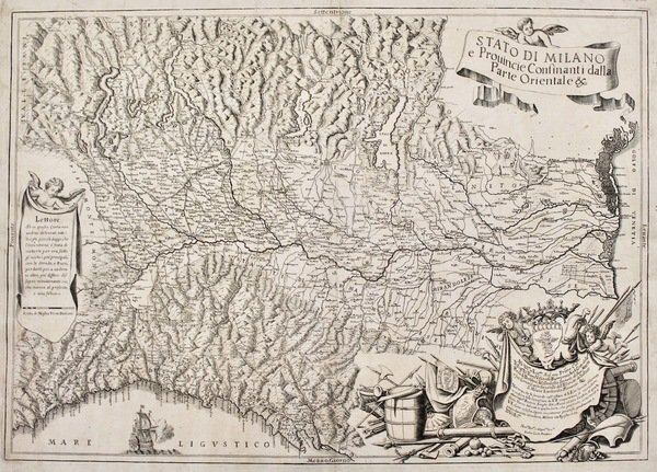Acquaforte e bulino, mm 426x614. Titolo entro nastro sorretto da putto alato in alto a destra. A metà altezza, presso il margine sinistro, un drappo è sorretto da un altro putto alato con iscrizione: "Lettore / Se in questa carta non / uedrai delineati tutti i / luoghi piccoli, sappi che / l'intentione è stata di / metterti per ora sotto / gl'occhi i più principali, / con le Strade, e Fiumi, / per darti poi a uedere / in altro più diffuso dis- / segno minutamente cio (sic), / che manca al presente, / e uiui felice" cui segue la "Scala di Miglia Venti Ittaliani". All'angolo inferiore destro campeggia un elaborato cartiglio di gusto barocco, decorato con armi di vario genere, il quale inquadra un drappo sorretto da due putti recante l'iscrizione di dedica: "All Ill.mo et Ecc.mo Sig.r mio Prone Col. Mo / Il Sig.r Pirro Visconte Borromeo Arese Conte della / Pieue di Trebbia del Consiglio Secreto di sua Maestà / e suo Commissario Generale dell'Essercito dello Stato / di Milano Lombardia Piemonte &c. / Nel tempo, che stò servendo nell'offizio di V. E. hò auuto il comodo, / in occasione delle Commissioni da V. E. compartitemi, di riconoscere / attentam.te Prouincie, Luoghi, Siti, e Fiumi co' loro Confini di questo / Stato. Vanno delinati in questa Carta, che presento, anzi rendo a / V.E. come cosa sua. Spero incontrarne generoso gradimento, e / profondamente m'inchino. Milano 28 Agosto 1703. / Di V'ra Ecc.za / Hu.mo Diu.mo, e obligat.mo Ser.re / Giulio Carlo Frattino". Sopra al drappo campeggia lo stemma visconteo col "biscione", simbolo di Milano, sormontato da corona comitale. <BR>La carta mostra interamente la Lombardia, il Veneto e la Liguria nonché parte dell'Emilia Romagna fino a Bologna e della Toscana fino a Massa. La rappresentazione geografica è assai sommaria e poco elegante rispetto a quella di altre carte coeve, ma è al compenso molto più corretta ed efficace. <BR>La carta fu indubbiamente pubblicata come foglio isolato; l'autore, infatti, in uno dei cartigli preannuncia l'uscita di una carta successiva più particolareggiata, di cui tuttavia non si ha notizia. Dell'autore non si possiedono dati certi, a parte il fatto che l'anno successivo alla pubblicazione di questa carta, cioè nel 1704, Frattino pubblicò una mappa dei territori confinanti a occidente con lo Stato di Milano. Come egli stesso afferma nella dedica, ebbe modo di viaggiare per tutto il territorio rappresentato sulla carta nello svolgimento delle mansioni affidategli dal dedicatario, Pirro Visconti Borromeo, Commissario Generale dell'esercito. Da ciò si deduce che Frattino fu probabilmente un funzionario militare incaricato di raccogliere notizie di prima mano sui più svariati territori.<BR>Il nostro esemplare mostra parecchie varianti rispetto a quello visionato da R. Sanfelici e S. Zanasi (R. Sanfelici - Stefano Zanasi, Terre di Langobardia, Modena, 2003), sia dal punto di vista toponomastico, che da altri evidenti particolari, quali la disposizione dei caratteri nei cartigli, la presenza di località assenti nell'altro, le differenti distanze dai margini etc. Probabilmente, per l'assenza della citazione dell'incisore Simone Durello, presente nell'esemplare citato, e all'impressione molto più fresca rispetto a quello, il nostro esemplare potrebbe essere uno stato precedente a quello definitivo. <BR>Arrigoni-Bertarelli 1930; Davoli-Sanfelici-Zanasi, Terre di Langobardia, 45, pag. 108; Tooley 1979, p. 224.