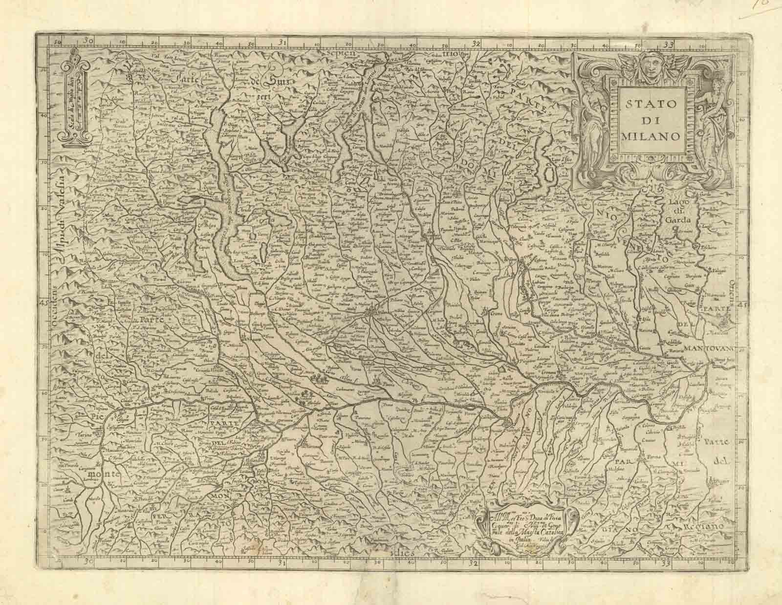 Carta geografica dello Stato di Milano. Il titolo è iscritto in decorativo cartiglio nell'angolo in alto a destra. All'angolo opposto è riportata la scala grafica ".di Miglia dieci". In basso sulla destra, entro decorativo cartiglio a volute, la dedica della carta al "Duca di Feria, Governatore di Milano e Generale della maestà Catolica in Italia". Piega centrale editoriale. Ottimo esemplare.