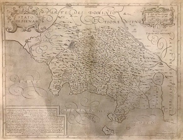 Carta geografica originale (cm. 49,5x38 più modesti margini bianchi) incisa dal fiammingo Arnoldo di Arnoldi. Esemplare controfondato ed in una impressione piuttosto tenue. Alcuni piccoli restauri all’angolo inferiore destro. Molto rara.Cfr. Bifolco-Ronca, ‘Cartografia e topografia italiana del XVI Secolo, pp. 1994-95, tav. 1005; Pellegrini, ’Il territorio senese nella cartografia antica’, pp. 128-31; Rombai, ‘Imago et descriptio Tusciae’, p. 107.