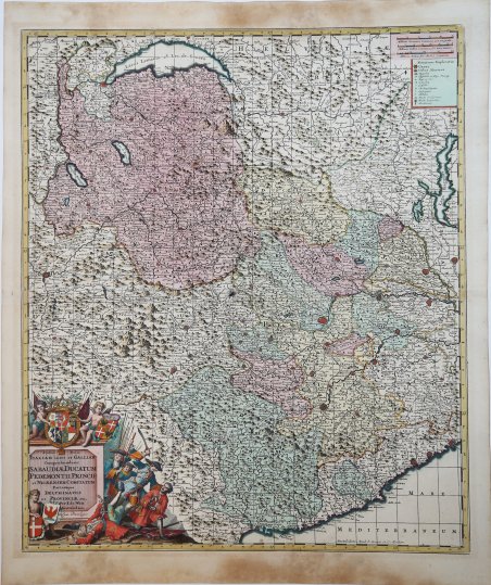 Edita per la prima volta dal De Wit nel 1680, la carta diviene subito molto popolare, e pertanto ristampata più volte. Sono infatti noti differenti stati di questa mappa.Esemplare dello stato definitivo, edito sempre ad Amsterdam dagli eredi Covens e Mortier, databile pertanto circa al 1720. De Wit era uno dei più importanti e rinomati incisori e editori di mappe di Amsterdam, nel periodo successivo al declino dell’attività di Blaeu e Jansson, dai quali aveva acquistato molte lastre quando vennero vendute all’asta. La sua opera, di considerevole bellezza dal punto di vista della grafica e della coloritura, venne stampata in numerose edizioni, persino dopo la sua morte, principalmente ad opera degli editori Covens e Mortier. Incisione in rame, finemente colorata a mano, in eccellente stato di conservazione. Molto decorativa. Edita per la prima volta dal De Wit nel 1680, la carta diviene subito molto popolare, e pertanto ristampata più volte. Sono infatti noti differenti stati di questa mappa.Esemplare dello stato definitivo, edito sempre ad Amsterdam dagli eredi Covens e Mortier, databile pertanto circa al 1720. De Wit era uno dei più importanti e rinomati incisori e editori di mappe di Amsterdam, nel periodo successivo al declino dell’attività di Blaeu e Jansson, dai quali aveva acquistato molte lastre quando vennero vendute all’asta. La sua opera, di considerevole bellezza dal punto di vista della grafica e della coloritura, venne stampata in numerose edizioni, persino dopo la sua morte, principalmente ad opera degli editori Covens e Mortier. Incisione in rame, finemente colorata a mano, in eccellente stato di conservazione. Molto decorativa. Cfr.