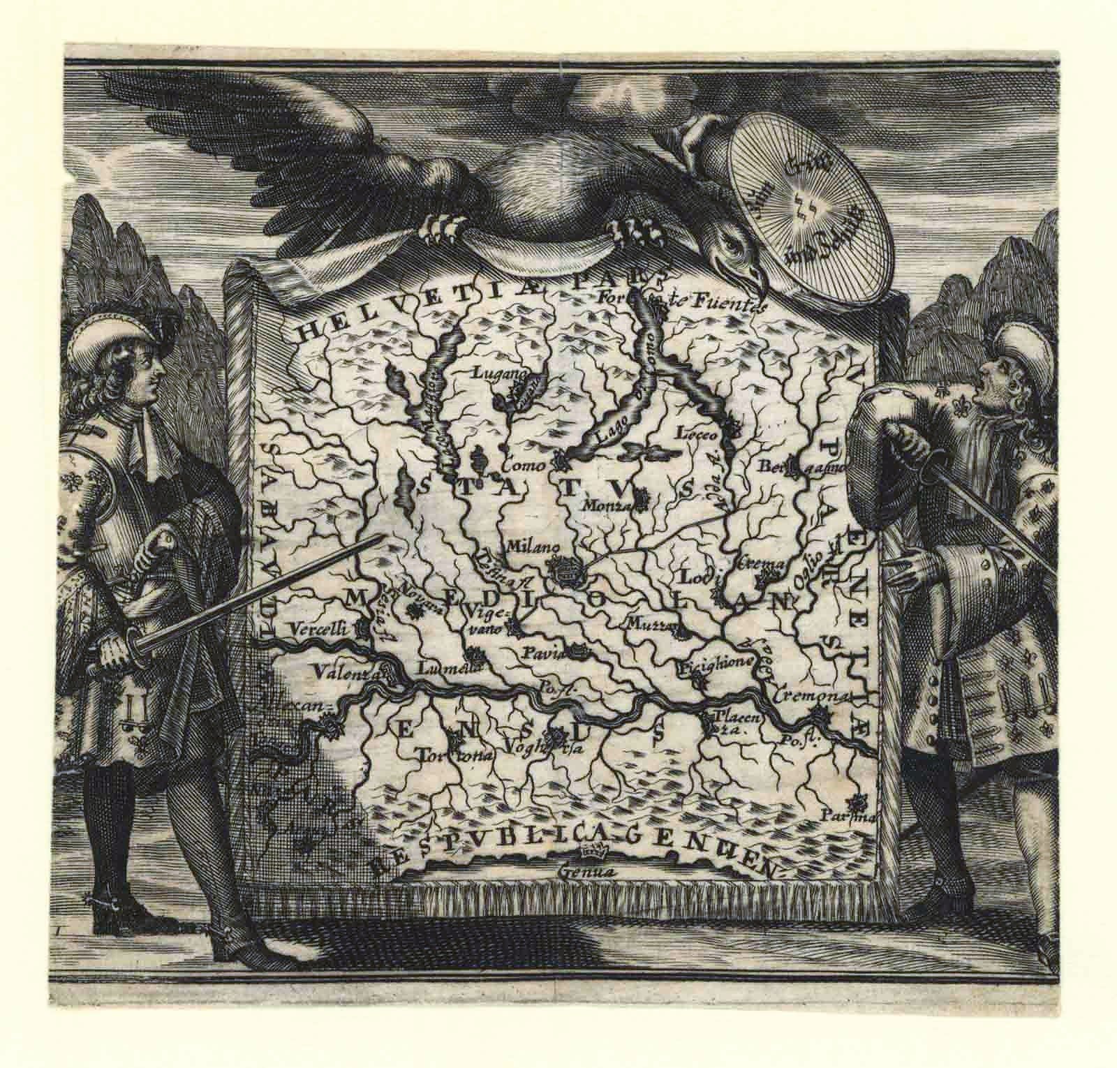 Piccola ma assai curiosa carta dello Stato di Milano raffigurata su di un grande arazzo sorretto dall'aquila austriaca, che lo stringe fra i suoi artigli; ai lati due soldati spagnoli sono invitati a togliere le mani dai suoi possedimenti. Si trova inserita nell’opera "Das Neu-geharnischte Meyland oder umstanliche Bescheibund des jezt von Krieg Staats Meylands." stampata a Norimberga nel 1702 da Germanus Adlerhold.Bibliografia: Cremonini, p. 68, n. 52, fig. a p. 69.