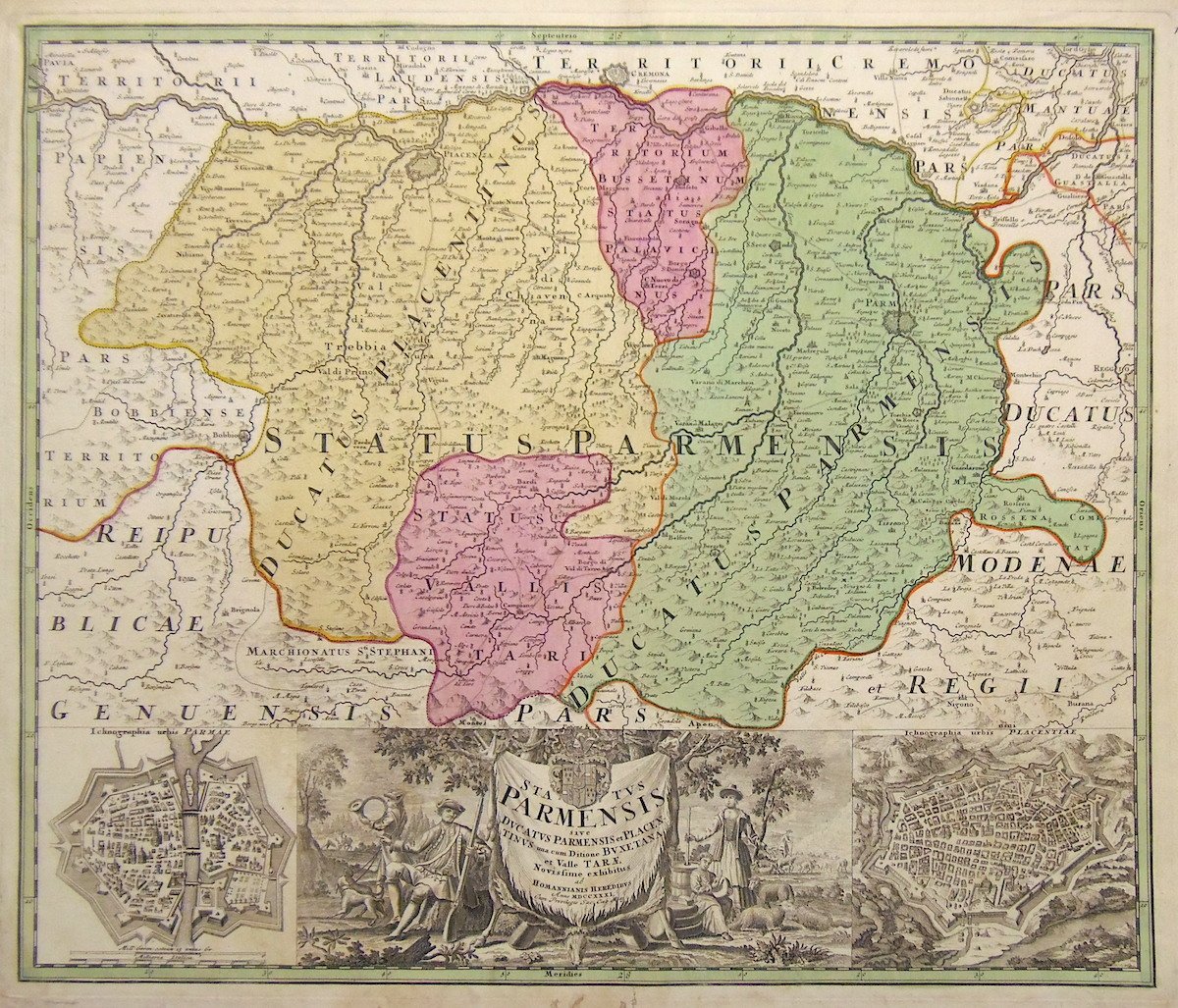 Incisione in rame, mm 495x580, dipinta d'epoca. Interessante carta geografica con ricco cartiglio figurato in basso con ai lati piante di Parma e Piacenza. J.B. Homann, nato a Norimberga nel 1663. Questi, dopo l'apprendistato presso D. Funk e G. Sandrart, nel 1702 iniziò una propria produzione cartografica, raggiungendo ben presto un notevole successo per l'eleganza e la modernità, ben amalgamando aspetto scientifico e decorativo. Nel 1707 pubblicò il primo atlante, arricchendolo rapidamente fino a superare il centinaio di carte con il 'Grosser Atlas" di 126 carte. Morì nel 1723.<BR>Bell'esemplare, piccoli restauri marginali in basso.