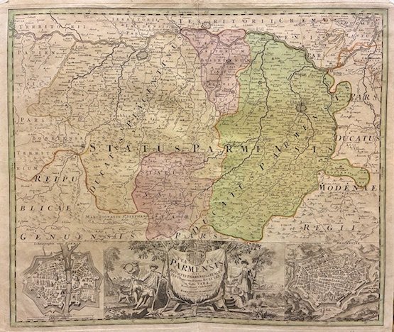 Carta geografica originale (cm. 57x49 ca. più margini bianchi). Coloritura coeva all’acquarello. Lieve ed uniforme brunitura, peraltro esemplare in ottimo stato di conservazione. Nella parte inferiore un ricco cartiglio allegorico con ai lati le piante delle città di Parma e Piacenza.
