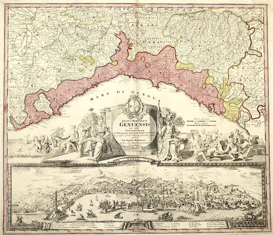 Incisione in rame, 485x557, colorata d'epoca, arricchita con bellissimo cartiglio centrale in bianco e nero. Nella parte inferiore presenta una veduta prospettica della città di Genova a volo d'uccello (in bianco e nero). J.B. Homann nasce a Norimberga nel 1663; lavora inizialmente per David Funk e per Giacomo Sandrart e finchè all'inizio del '700, nel 1702, inizia una propria produzione cartografica, raggiungendo ben presto un notevole successo per l'eleganza e la modernità, ben amalgamando aspetto scientifico e decorativo. Nel 1707 pubblica il primo atlante, arricchendolo rapidamente fino a superare il centinaio di carte con il 'Grosser Atlas" di 126 carte. Muore nel 1723.