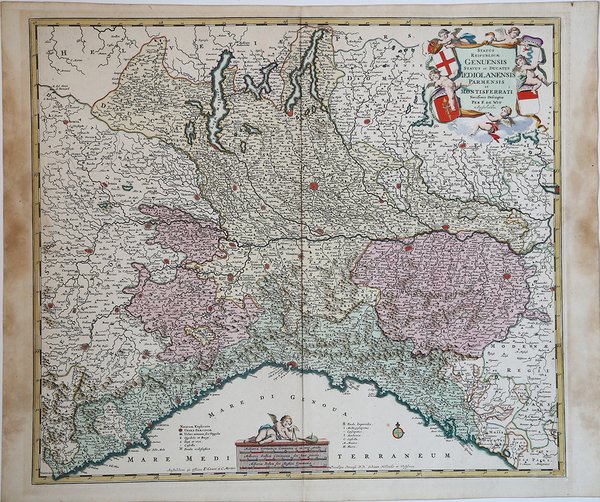 Edita per la prima volta dal De Wit nel 1680, la carta diviene subito molto popolare, e pertanto ristampata più volte. Sono infatti noti differenti stati di questa mappa.Esemplare dello stato definitivo, edito sempre ad Amsterdam dagli eredi Covens e Mortier, databile pertanto circa al 1720. De Wit era uno dei più importanti e rinomati incisori e editori di mappe di Amsterdam, nel periodo successivo al declino dell’attività di Blaeu e Jansson, dai quali aveva acquistato molte lastre quando vennero vendute all’asta. La sua opera, di considerevole bellezza dal punto di vista della grafica e della coloritura, venne stampata in numerose edizioni, persino dopo la sua morte, principalmente ad opera degli editori Covens e Mortier. Incisione in rame, finemente colorata a mano, in eccellente stato di conservazione. Molto decorativa. Map of north Italy with relief shown pictorially.Copper engraving, finely colored by hand, in excellent state of preservation. Very decorative. Cfr.