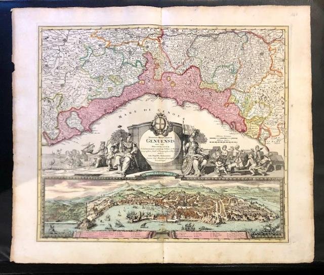 Augusta, 1720 circa. Incisione in rame, colore d’epoca, cm 50 x 57,5 (alla lastra), più margini. Nella parte superiore carta geografica della Liguria, in quella inferiore una dettagliata veduta a volo d’uccello della città di Genova (non ci sono le due scene ai lati in riquadro); al centro un cartiglio con piccolo stemma e ricchissimo di figure allegoriche; in basso una veduta a volo d'uccello con 25 richiami per le cose notabili. Se le carte del Seutter molto assomigliano a quelle dell’Homann, tanto da non essere talvolta subito distinguibili, ciò che maggiormente le differenzia riguarda il cartiglio,spesso enormemente accresciuto e arricchito, con l’importanza delle figure legate al mito e all’allegoria, in quelle del Seutter rispetto a quelle dell’Homann, e come anche in questo caso, pure che si tratti qui di una carta Homann e non Seutter. Questa carta reca infatti un titolo simile ma leggermente diverso alla classica versione Seutter, presenta un cartiglio arricchito e importante come quella Seutter ma presenta la veduta generale, in basso, senza i riquadri, invece presenti in quelle versioni. Potrebbe pertanto trattarsi di una versione Homann di qualche ano antecedente, ossia ascrivibile al 1720 circa, da cui le successive, sia Homann che Seutter hanno poi preso spunto. Esemplare in margini, in bella coloritura e in buono stato di conservazione. .