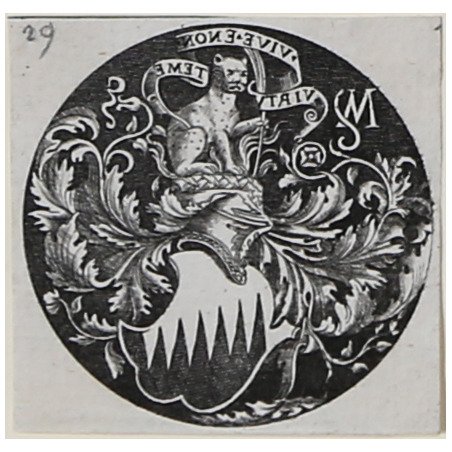 Copia, nello stesso verso, da un niello appartenuto alla collezione Durazzo oggi conservato a Lawrence. I nielli della collezione Durazzo vennero fatti riprodurre in incisioni proprio dal proprietario, tra fine XVIII e inizio XIX secolo, a Venezia, costituendo una serie che venne diffusa e collezionata dagli amatori. Bartsch descrive queste copie nel suo volume edito nel 1811, data che quindi costituisce il termine ante quem per l'esecuzione. ' La composizione viene ricondotta ad un ambito bolognese in base all'identificazione dello stemma con quello della famiglia Bentivoglio (cfr. Zucker 1993). ' Copy, on the same verso, from a niello formerly belonging to the Durazzo collection, now ' at Lawrence. The coat of arms depicted is that of the ruling Bentivoglio family of Bologna. The nielli of the Durazzo collection were reproduced in prints by owner’s will, between the end of the 18th and the beginning of the 19th century, in Venice - as also specified by Malaspina in his catalog of 1824 - constituting a series that was circulated and collected by the amateurs. Cfr.