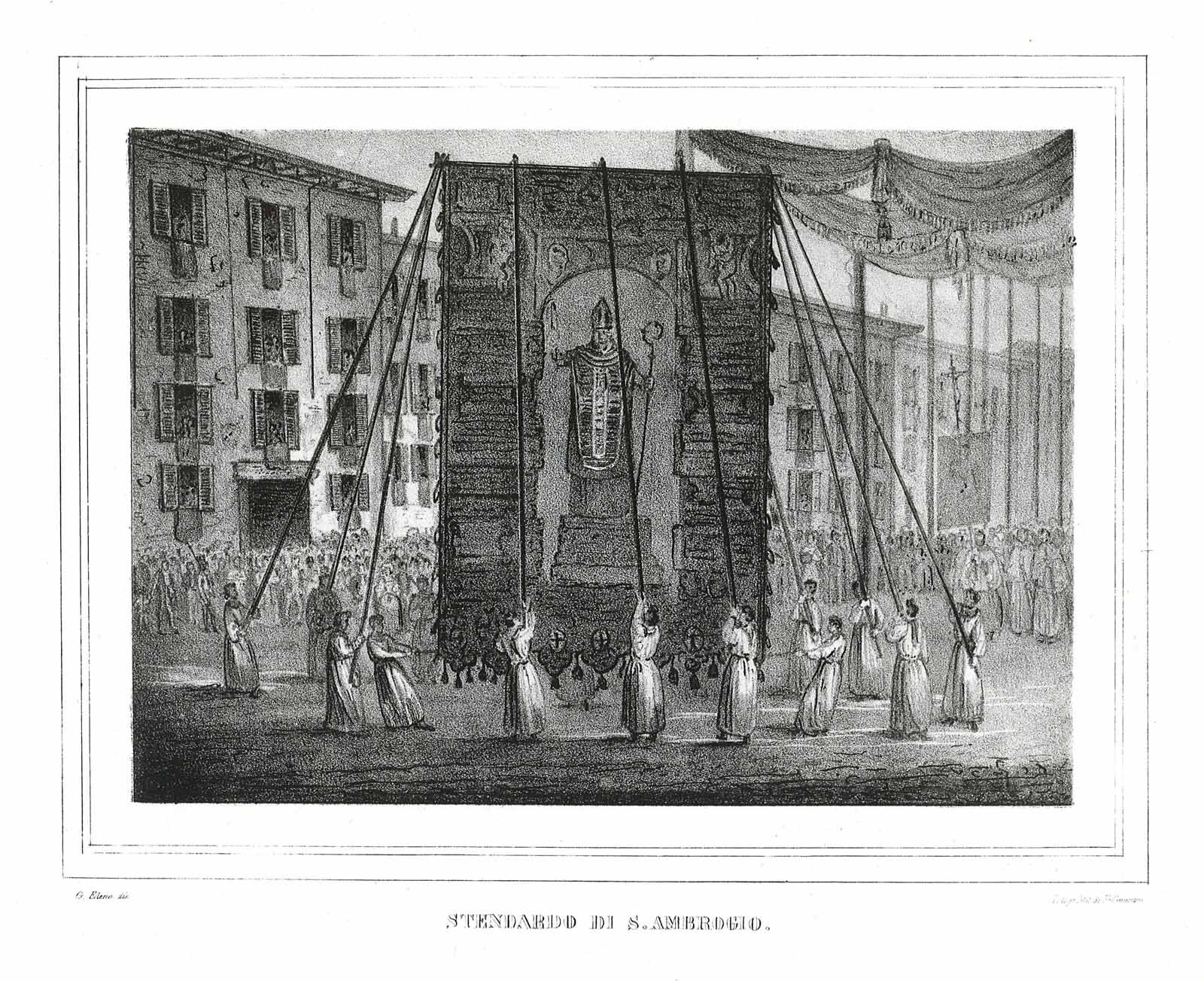 Raffigurazione del grande stendardo, sorretto da fedeli, durante una funzione religiosa.Rif: Arrigoni, "Milano nelle vecchie stampe", vol I, p. 63, n°181