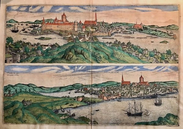 Incisione originale su rame (cm. 47x32,3 più ampi margini) dalla celebre e monumentale opera ‘Civitates Orbis Terrarum’ pubblicata tra il 1572 ed il 1617. Splendida coloritura coeva. Lieve brunitura lungo la piega centrale, ma esemplare in ottimo stato di conservazione.