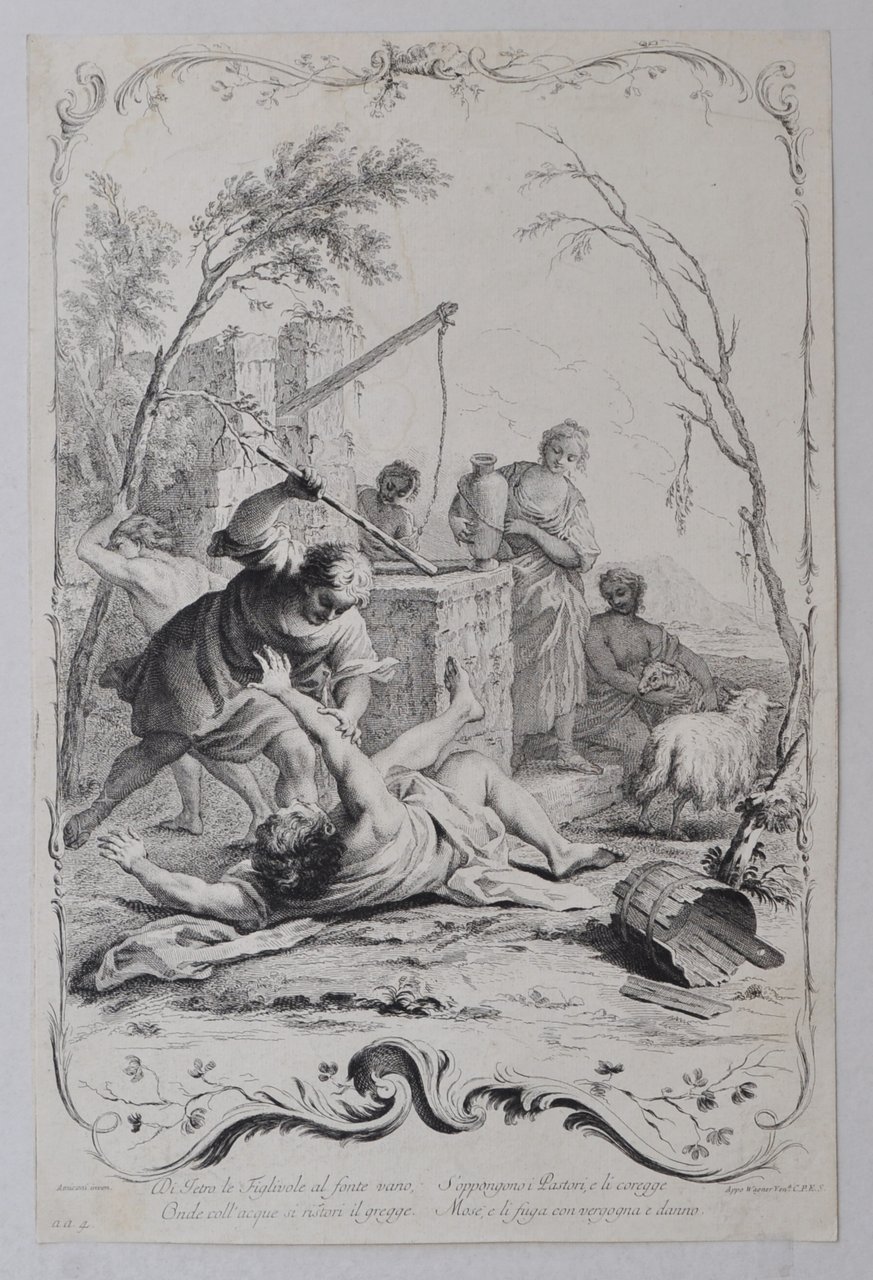 Cinque fogli incisi all'acquaforte di mm 341 x 515 alla battuta, su carta di filo veneziana; filigrana tre lune. Ottimo stato di conservazione. Questa serie piuttosto rara, relativa a eventi biblici, si completava in dodici fogli, tutti incisi da Wagner su disegni di Zocchi e Amigoni. I cinque fogli qui offerti rappresentano: "Abigail offre i doni a Davide", "Il sogno di Giacobbe" e "Mosè difende le figlie di Ietro"da Amigoni, "Giuseppe venduto dai fratelli" e "Il sacrificio della figlia di Ieste" da Zocchi. La serie è stata utilizzata anche per la realizzazione di maioliche da camino in Olanda: esiste ancora un esempio in perfetto stato di conservazione al Museo Tile di Otterlo; si potrebbe anzi pensare che uno degli sfruttamenti commerciali possibili di queste incisioni fosse proprio per il mercato della ceramica olandese. Comunque questa serie rappresenta una felicissima espressione di quella che fu forse la più importante fucina di artisti veneziani. Il rapporto tra l'Amigoni ed il Wagner era già profondamente consolidato quando, nel 1739, entrambi sbarcarono a Venezia; il grande incisore e calcografo tedesco aprì subito una bottega di incisione a San Zulian e ottenne il privilegio dal Senato della Repubblica per le sue stampe dal 1749. Alle opere stampate da Wagner senza una precisa indicazione dell'incisore possono aver lavorato, da soli o in partecipazione, i più grandi artisti veneziani del bulino, quasi tutti passati, per un tempo più o meno lungo, nella bottega a San Zulian; tra i più celebri si possono citare Flipart, Zilotti, Dall'Acqua, Berardi, Volpato, Brustolon, Leonardis, Daniotto, Zucchi.