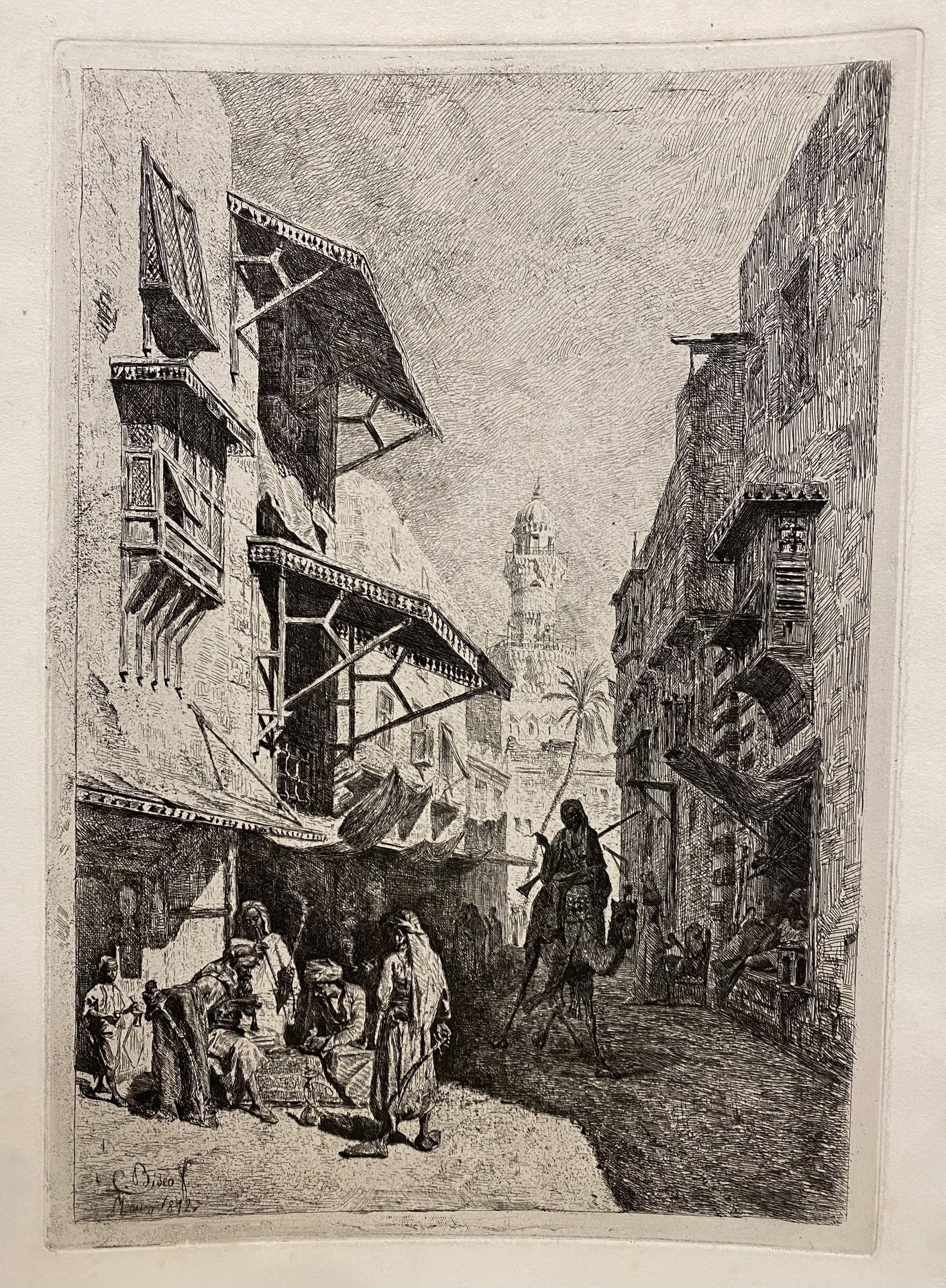 Nel foglio mediante un ardito gioco prospettico viene raffigurato un episodio di vita tra le strade del Cairo. L'autore venne chiamato dal vicerè d'Egitto per decorare il suo palazzo ad Alessandria. In basso a sinistra incisi: C. Biseo F in Roma 1872. All'acquaforte pura senza gli interventi a monotipo.