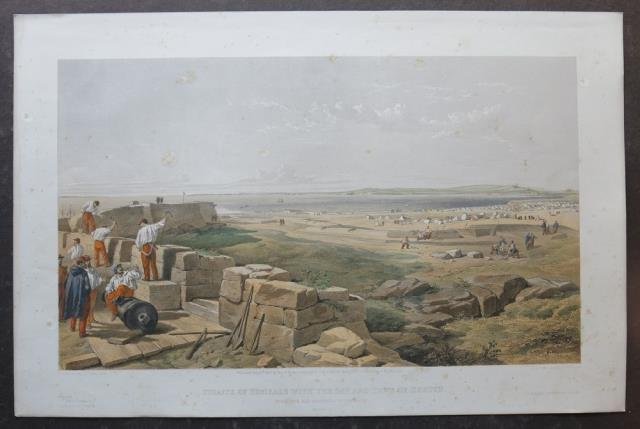 Tratta da “Seat of War in the East”. Paul & Dominic Colnaghi & C.°, London 1855 – 1856. Tonolitografia in recente ma bella coloritura a mano, cm 37 x 55,5 circa (il foglio). Disponiamo di numerose tavole appartenenti alla prima o seconda serie. Le tavole sono tutte delineate da William Simpson e litografate da vari autori, tra cui E. Walker, J. Needham, T. Picken e altri. Tranne un minimo e lieve foxing, bella coloritura e in buono stato di conservazione.