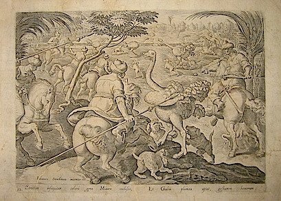 Incisione originale su rame (cm. 29x21 più ampi margini) da un disegno di Jan Van Der Straet (Giovanni Stradano) tratta dall’opera ‘Venationes Ferarum, Avium, Piscium.’ edita da Philip Galle. Carta filigranata. Una piccola macchia bruna visibile solo al verso del foglio e due strappetti abilmente restaurati. Nel complesso buon esemplare. Cfr. Baroni Vannucci, p. 371.